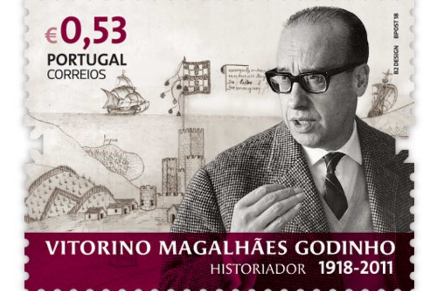 Finalmente, o historiador e político Vitorino Magalhães Godinho ilustra o último selo desta emissão com uma foto tirada por Eduardo Gageiro em 1970 e um pormenor do Castelo de Caminha (do livro das fortalezas situadas no extremo de Portugal e Castela, existente na Torre do Tombo).