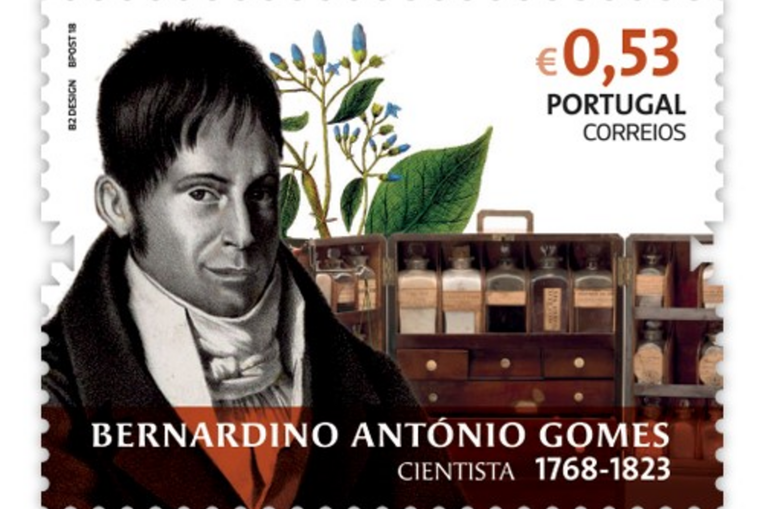 Já o médico dermatologista Bernardino António Gomes é reproduzido no selo onde é apresentada a Planta da Quinoa e a Farmácia Portátil, peça existente no Museu da Farmácia.