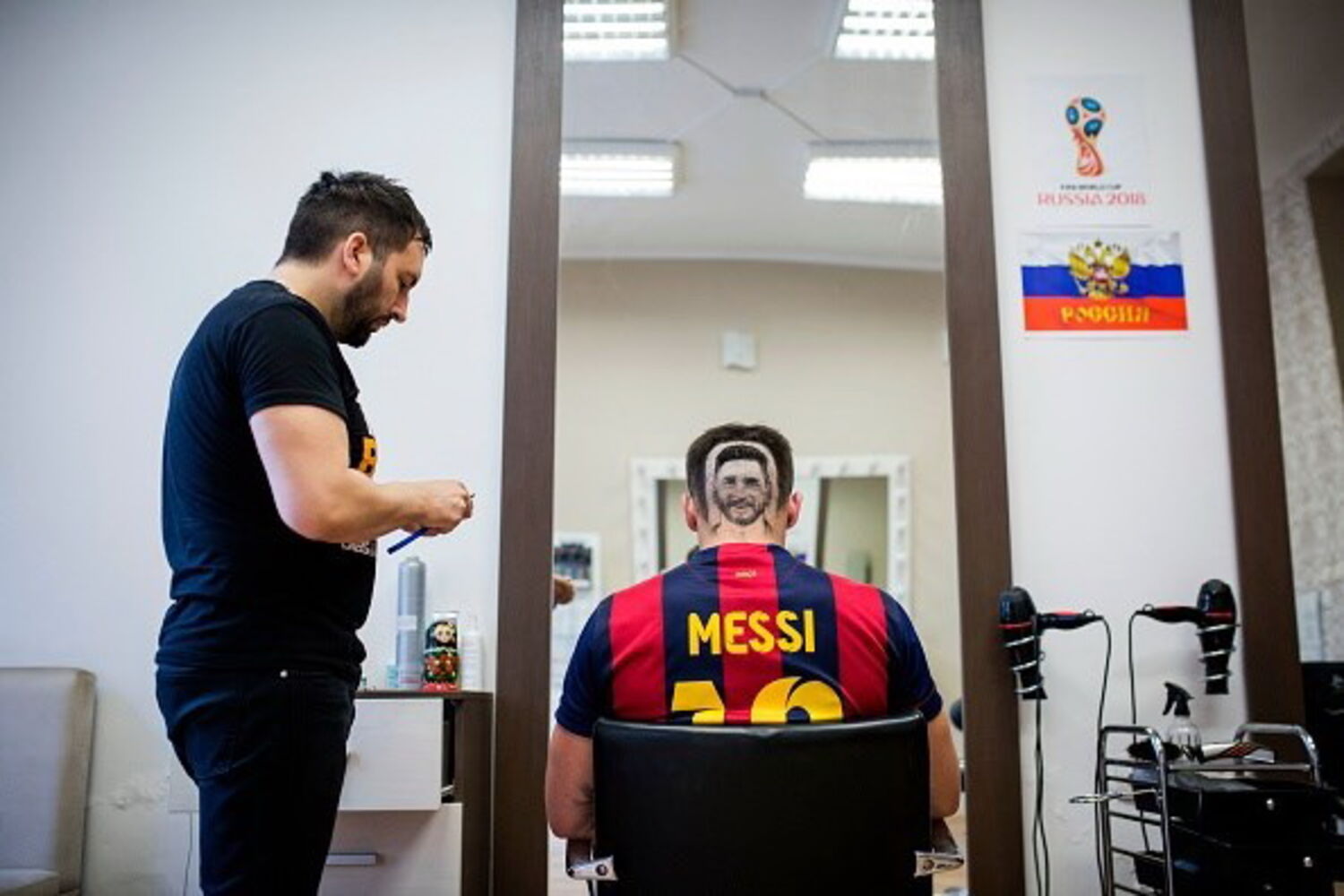 Este artista sérvio está a oferecer, por ocasião do Mundial de futebol, duas hipóteses de cortes inusitados aos seus clientes, que podem sair do seu estabelecimento com o cabelo em forma de Messi ou Cristiano Ronaldo.