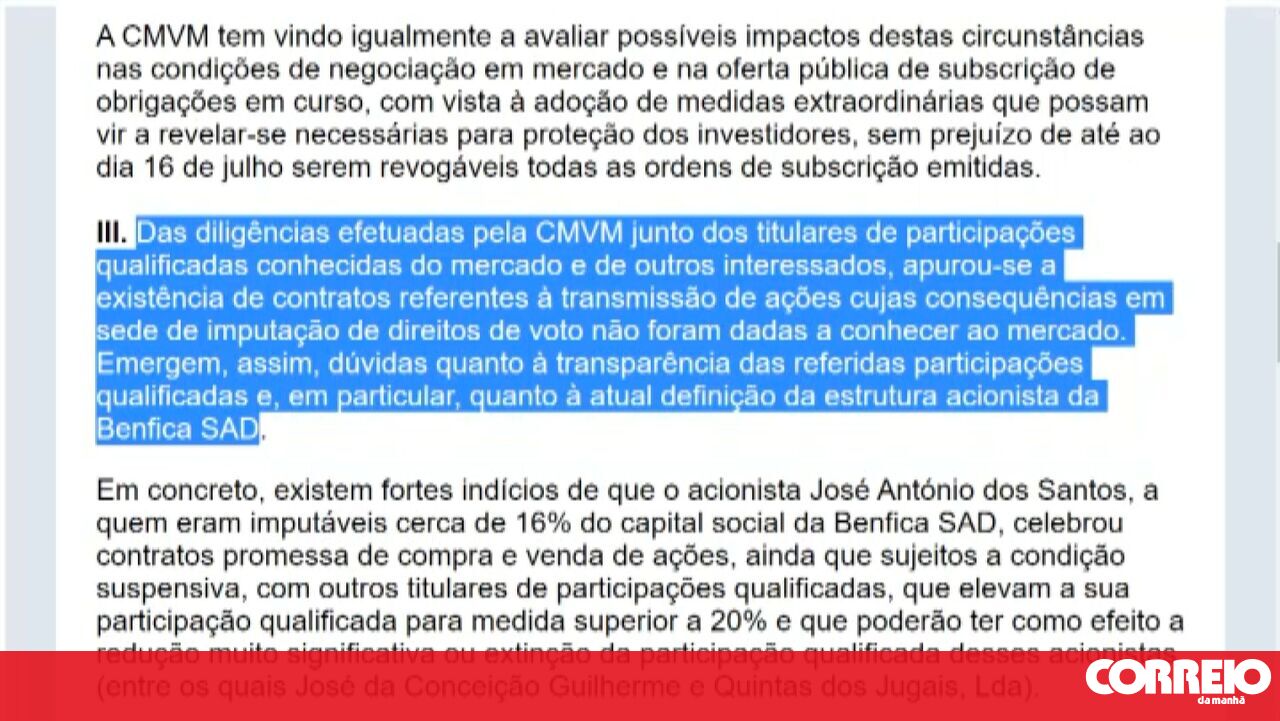 "Das diligências efetuadas pela CMVM junto dos titulares de participações qualificadas conhecidas do mercado e de outros interessados, apurou-se a existência de contratos referentes à transmissão de ações cujas consequências em sede de imputação de direitos de voto não foram dadas a conhecer ao mercado. Emergem, assim, dúvidas quanto à transparência das referidas participações qualificadas e, em particular, quanto à atual definição da estrutura acionista da Benfica SAD", pode ler-se.