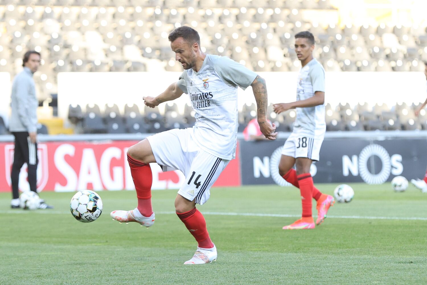 Nuno Tavares consegue progredir com bola pelo centro, mas precipita-se e remata com o pé direito com a bola sair longe da baliza.