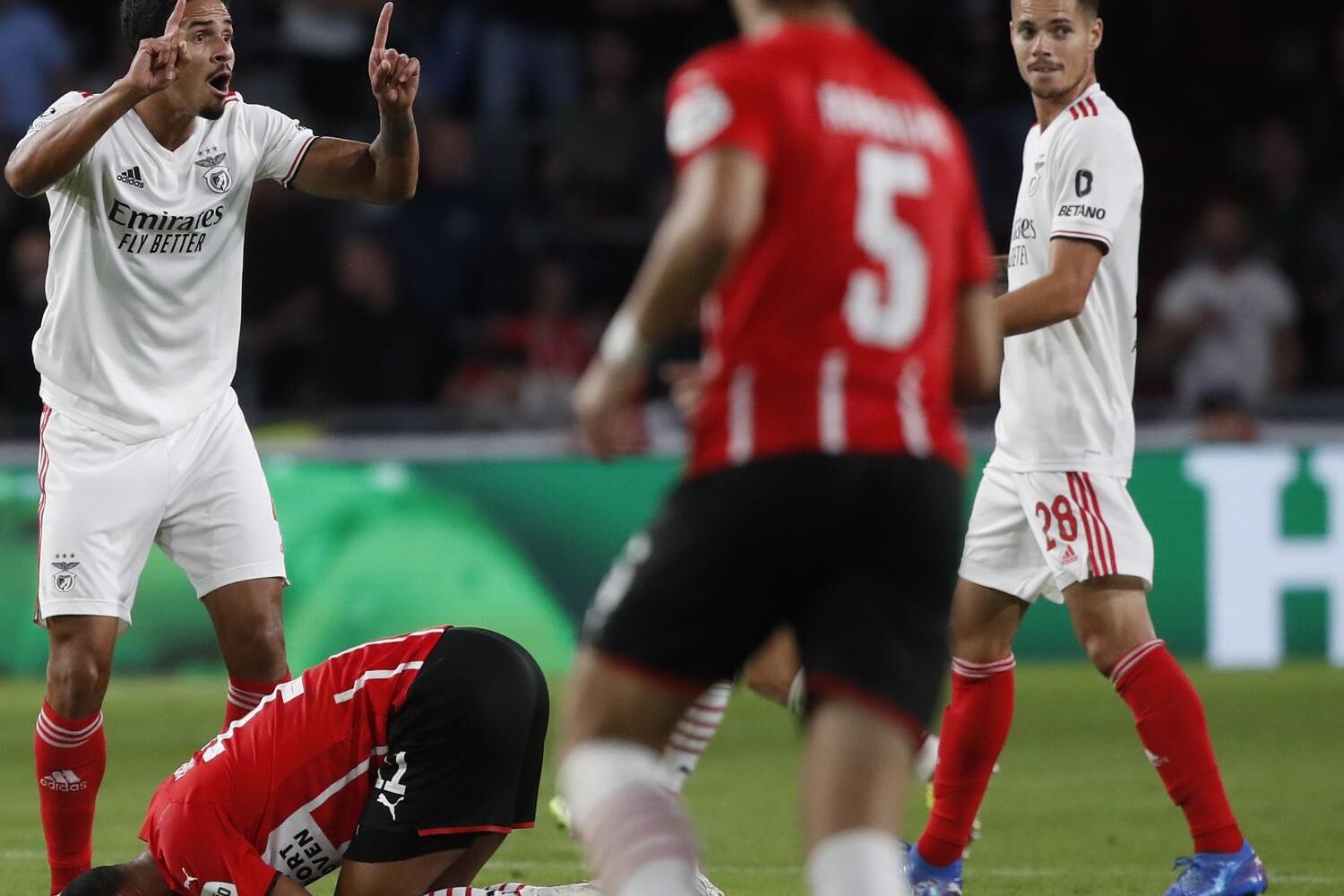 Lucas Veríssimo saltou para a disputa de bola com Gakpo e atingiu o extremo com o cotovelo. O árbitro não hesitou em mostrar o segundo amarelo e consequente vermelho.