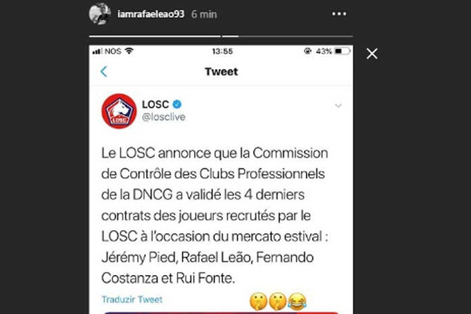 O jogador de 19 anos reagiu de imediato ao tweet do Lille, partilhando também a mensagem do clube da Ligue 1 nas redes sociais acompanhada por vários emojis.