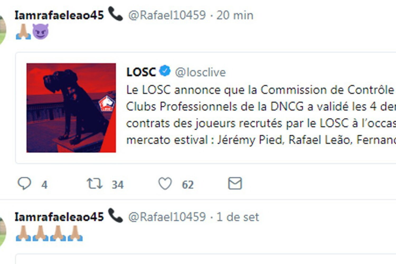 Le LOSC annonce que la Commission de Contrôle des Clubs Professionnels de la DNCG a validé les 4 derniers contrats des joueurs recrutés par le LOSC à l’occasion du mercato estival : Jérémy Pied, Rafael Leão, Fernando Costanza et Rui Fonte. pic.twitter.com/MpJVlRtXO3
