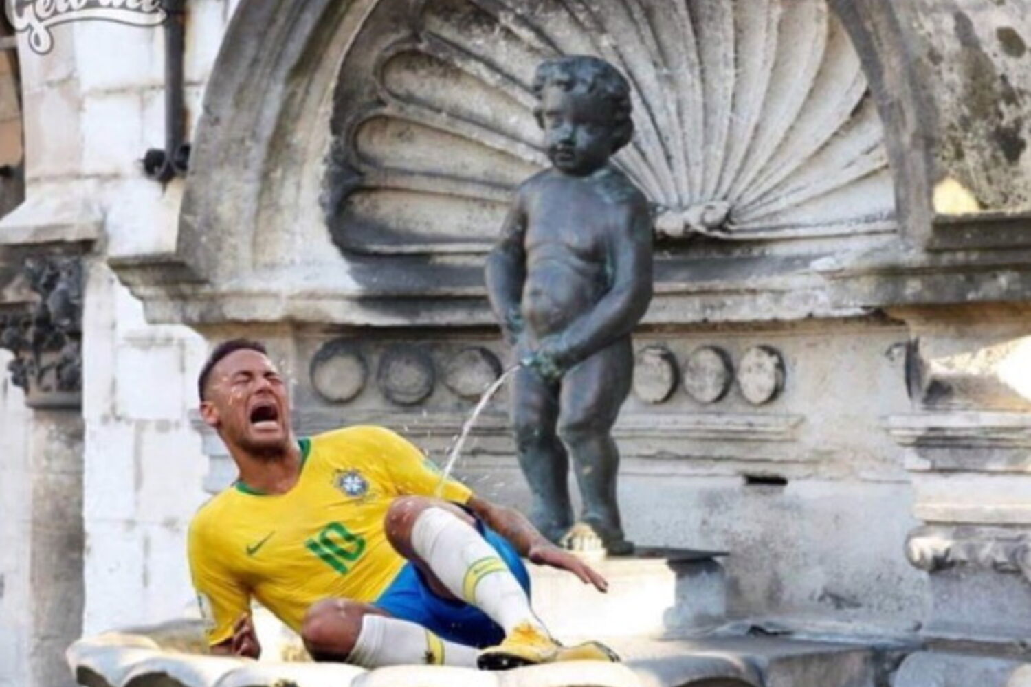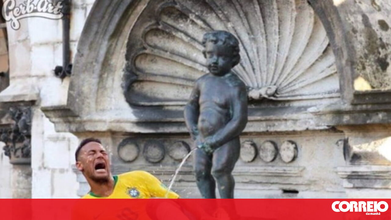 Uma montagem da famosa estátua Manneken Pis, em Bruxelas, a urinar em Neymar promete causar polémica um pouco por todo o mundo.