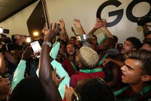 Comitiva lusa saudada em ambiente de euforia no aeroporto de Lisboa.