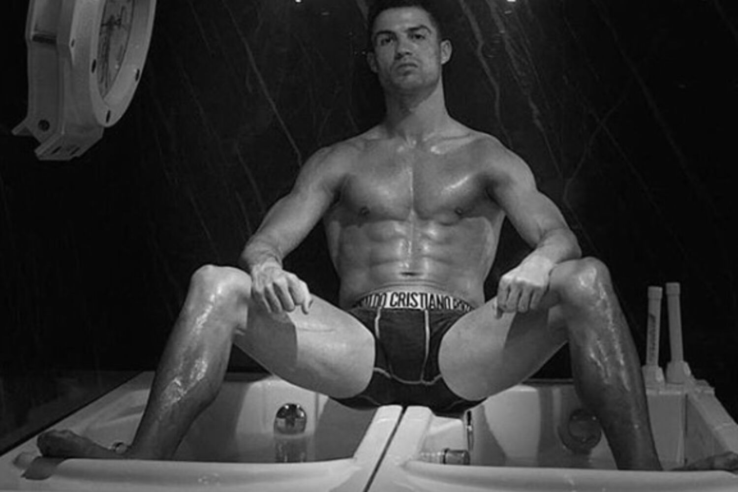 Nesta, CR7 surge de pernas abertas e com os seus abdominais em grande plano.