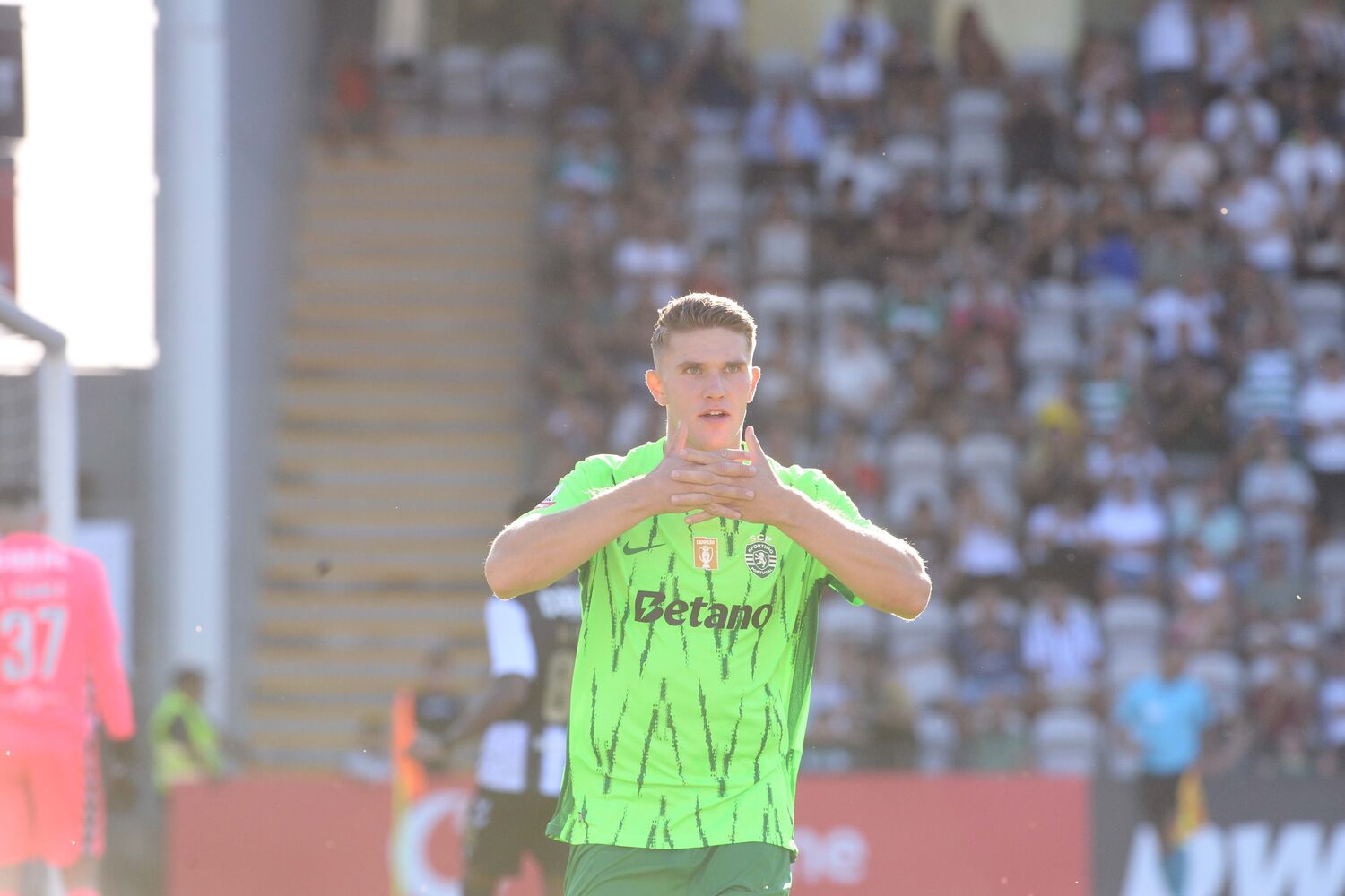 Pote serve Gyökeres que tenta o remate à meia volta com o pé direito mas acerta num adversário.