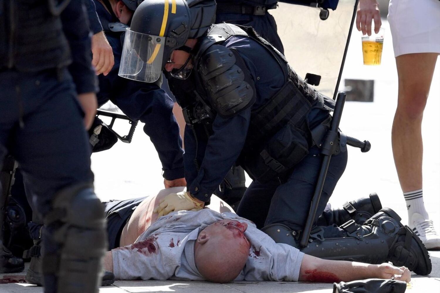 Um adepto inglês estava entre a vida e a morte, depois de ter sido agredido, cerca das 17h30 locais, "com barras de ferro, aparentemente na cabeça", indicou uma fonte policial.