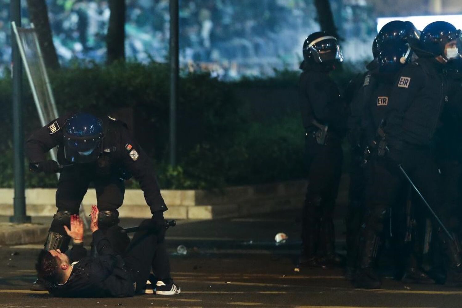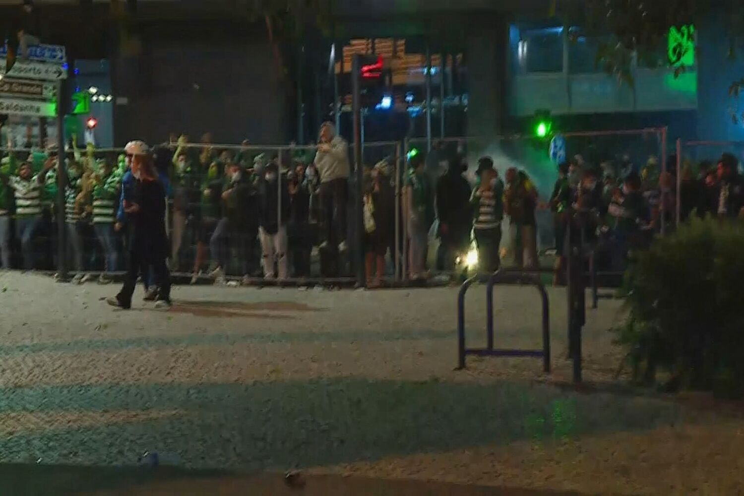 Alguns adeptos chegaram mesmo a sofrer ferimentos, tendo recebido prontamente assistência dos bombeiros, enquanto a multidão colocada nessa zona fugia à intervenção policial ou arremessava garrafas de vidro e tochas para o outro lado do gradeamento, onde, para além da polícia e dos bombeiros, apenas está presente a comunicação social.