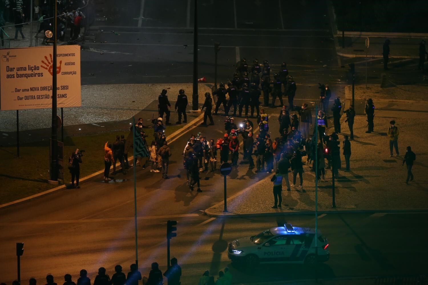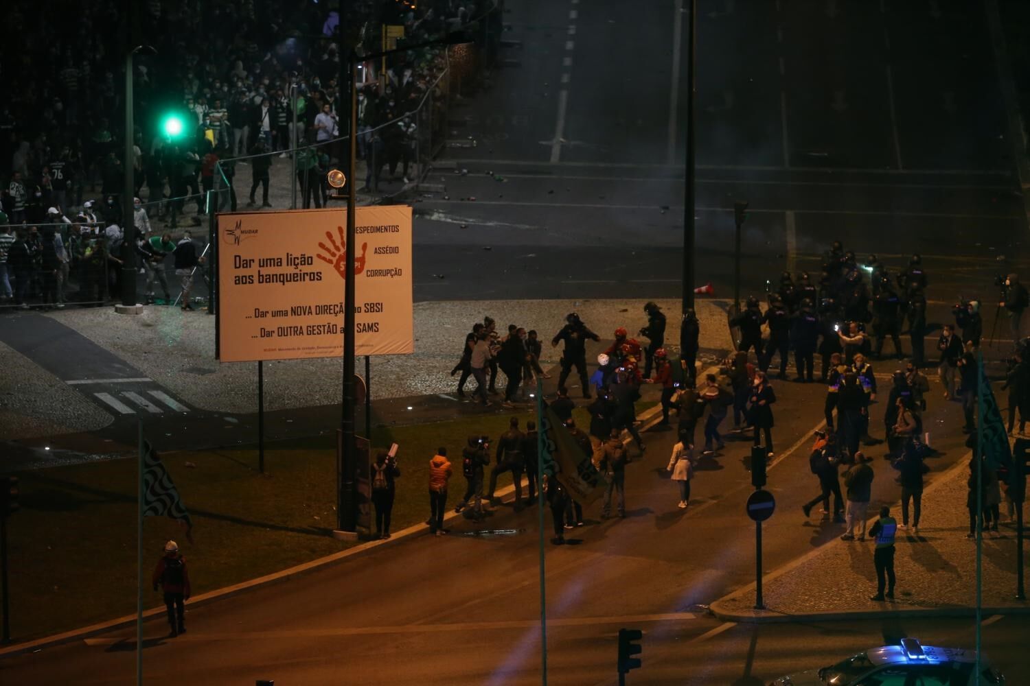 Um forte dispositivo policial tem procurado suster a euforia sportinguista, mas a Polícia de Segurança Pública (PSP) foi obrigada a intervir quando alguns adeptos derrubaram as grades, no início da avenida Fontes Pereira de Melo, que liga o Marquês de Pombal ao Saldanha.