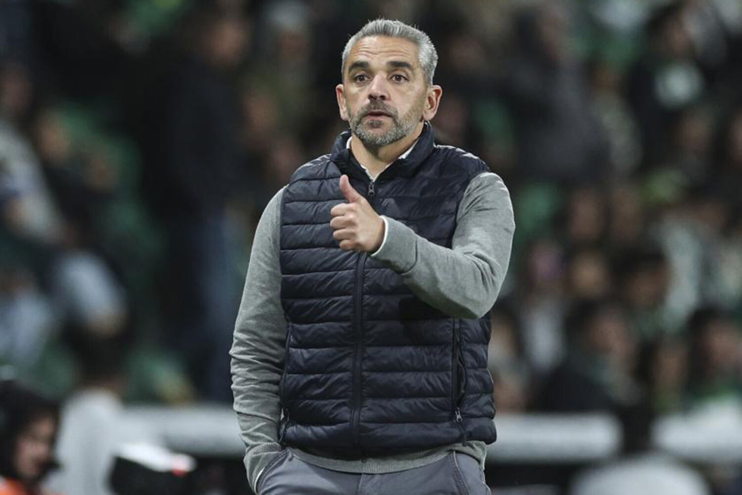 Que perigo! Javi Sánchez, num cabeceamento meio com ombro, atira para defesa atenta de Rui Silva.