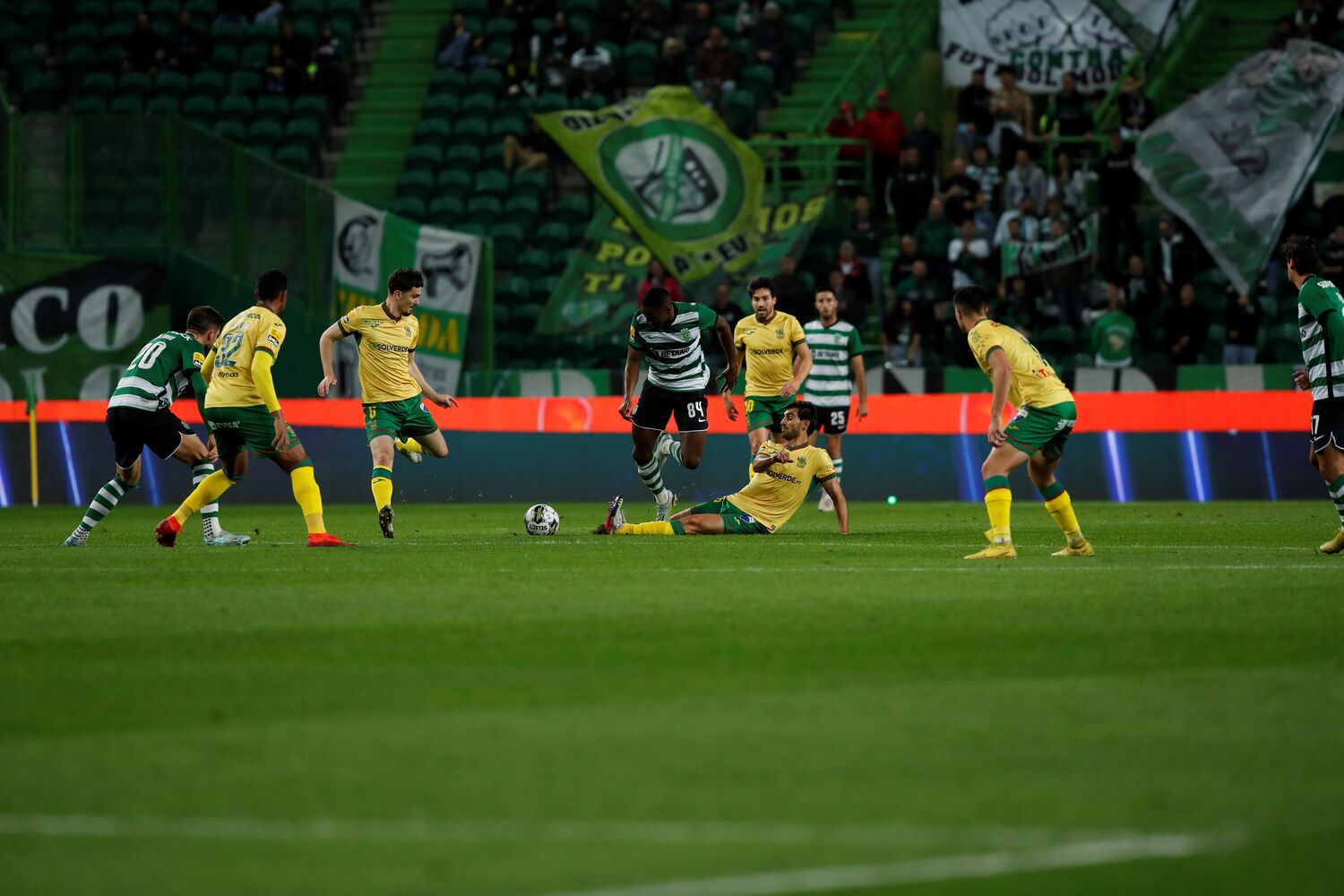 Oportunidade interceptada, Marcus Edwards (Sporting) remate com o pé direito no coração da área. Assistência de Paulinho.