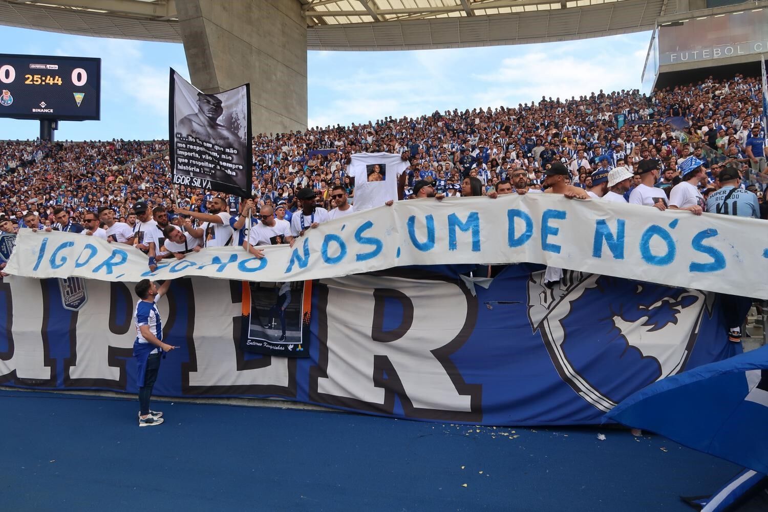 "Igor, como nós um de nós", lê-se na tarja mostrada pelos claque portista junto ao relvado. Outra bandeira personalizada com a foto do jovem e o seu nome também foi erguida entre o grupo apoiante. "No dia em que não me respeitarem, não importa, vão ter sempre que respeitar a minha história", lê-se estampado na tarja.