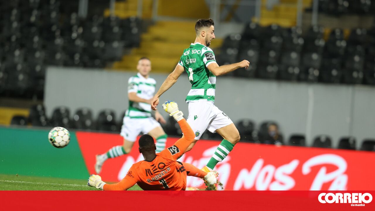 Grande oportunidade de Tiago Tomás (Sporting CP). Só com Bruno Varela pela frente, não foi capaz de evitar a mancha do guardião adversário.