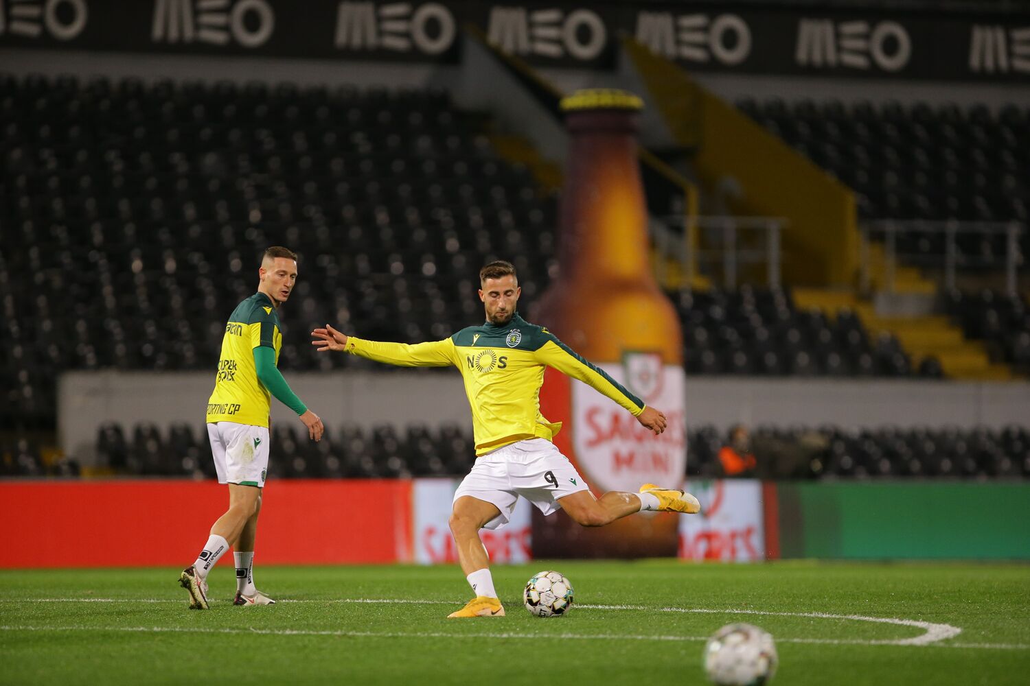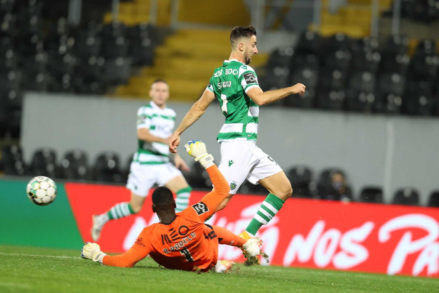 João Mário (Sporting CP) acertou na trave com remate com o pé esquerdo de fora da área. Pedro Porro cortou a bola. Antes, Sporar viu Bruno Varela antecipar-se.