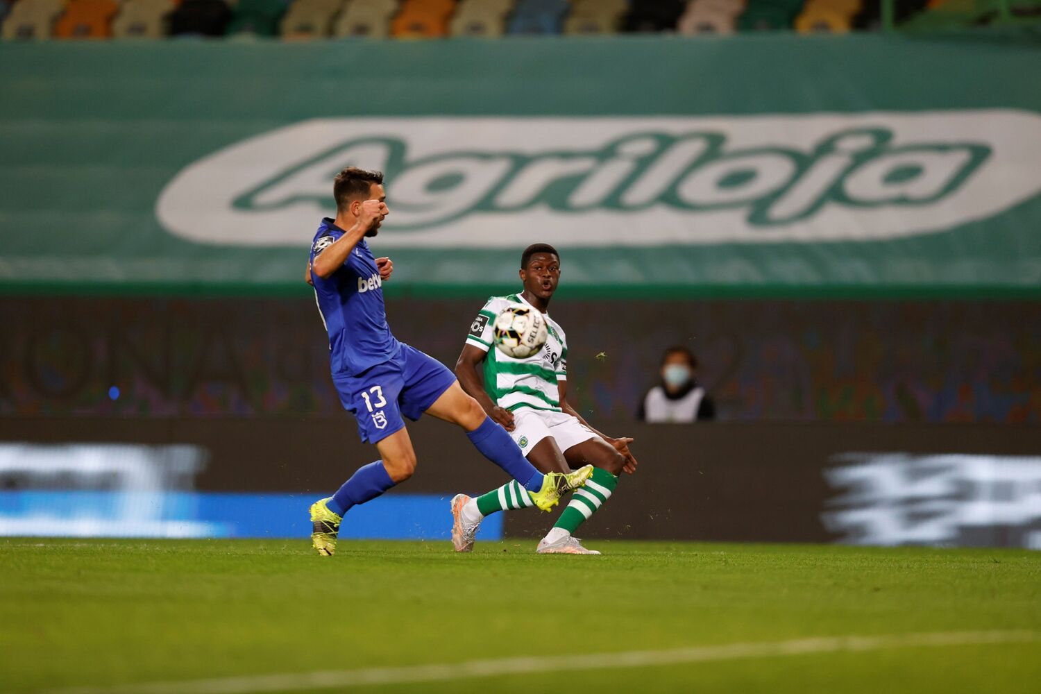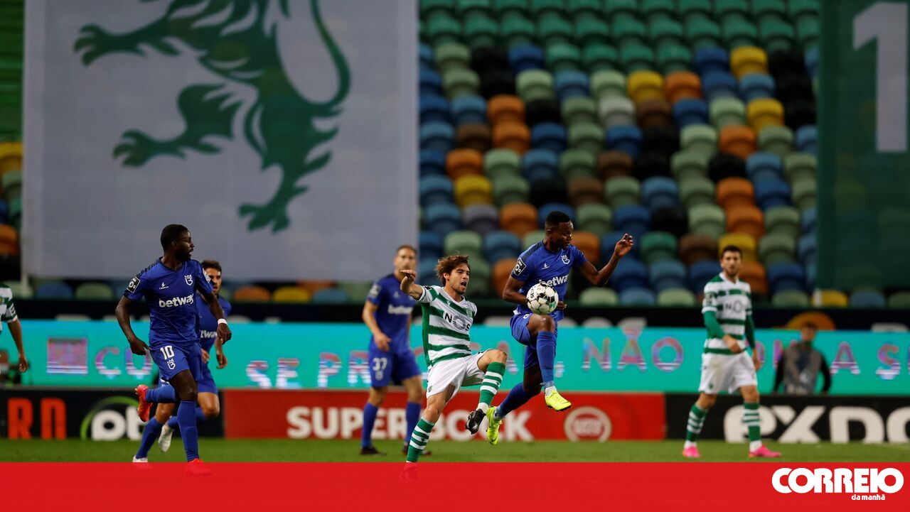 Livre estudado do Sporting, com Pote a receber um passe de João Mário e a dar de calcanhar para a entrada da área onde apareceu Nuno Mendes a rematar por cima da baliza dos azuis.