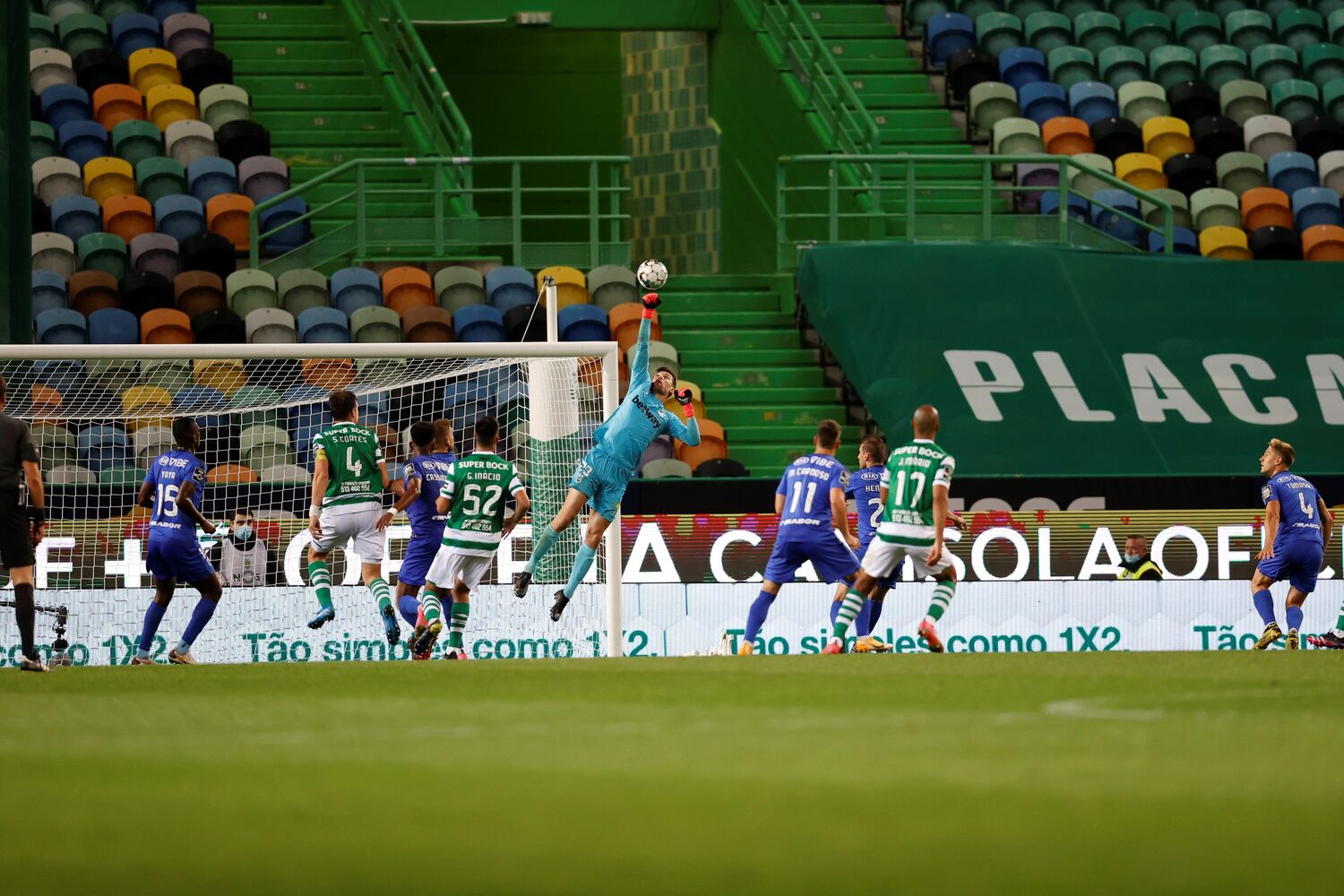 Na sequência do canto, Gonçalo Inácio a saltar mais alto que os defesas mas a bola a sair ao lado.