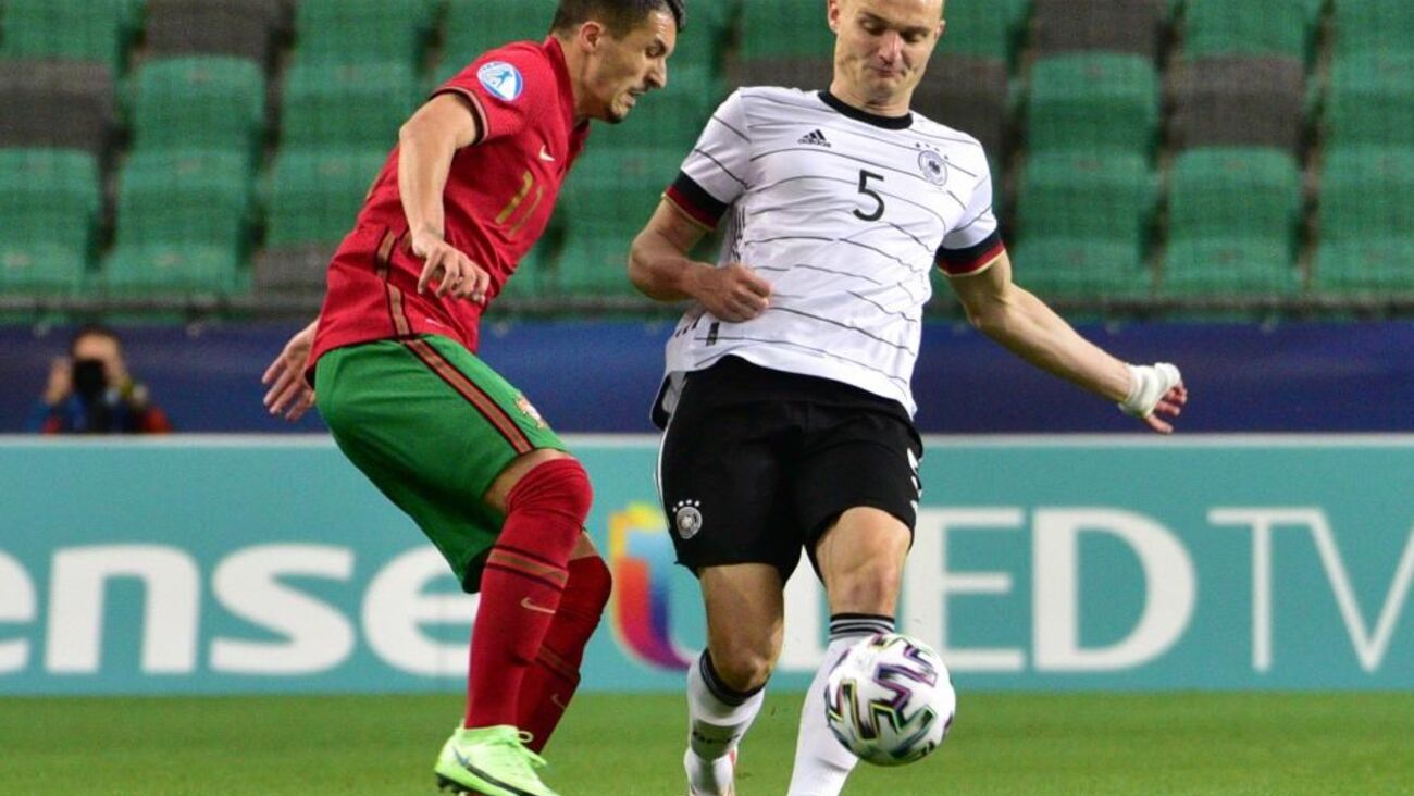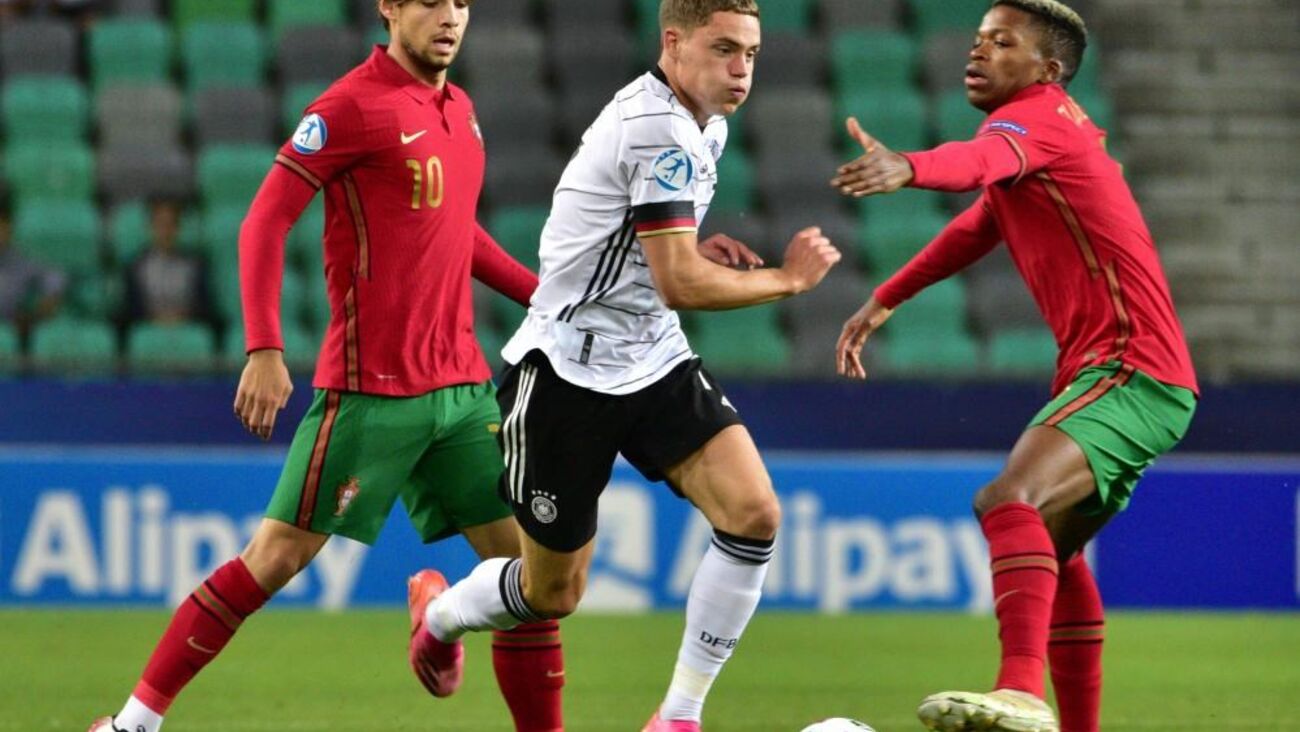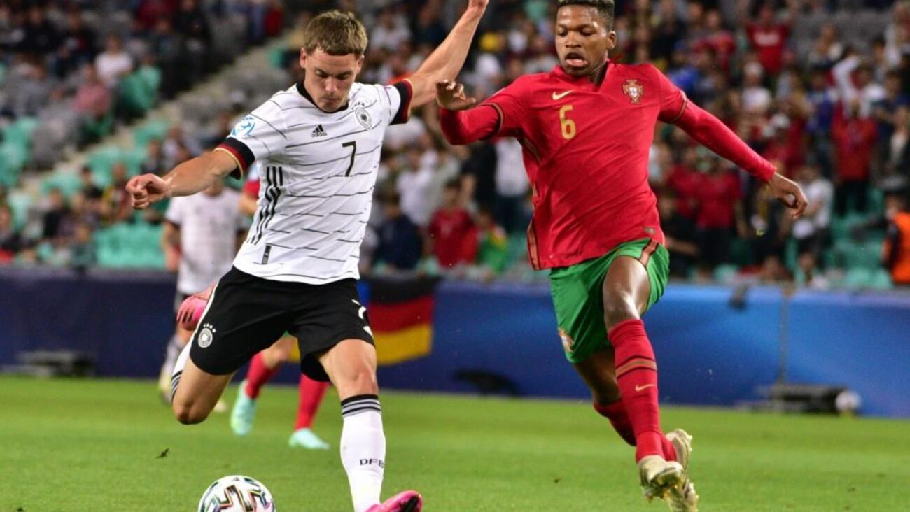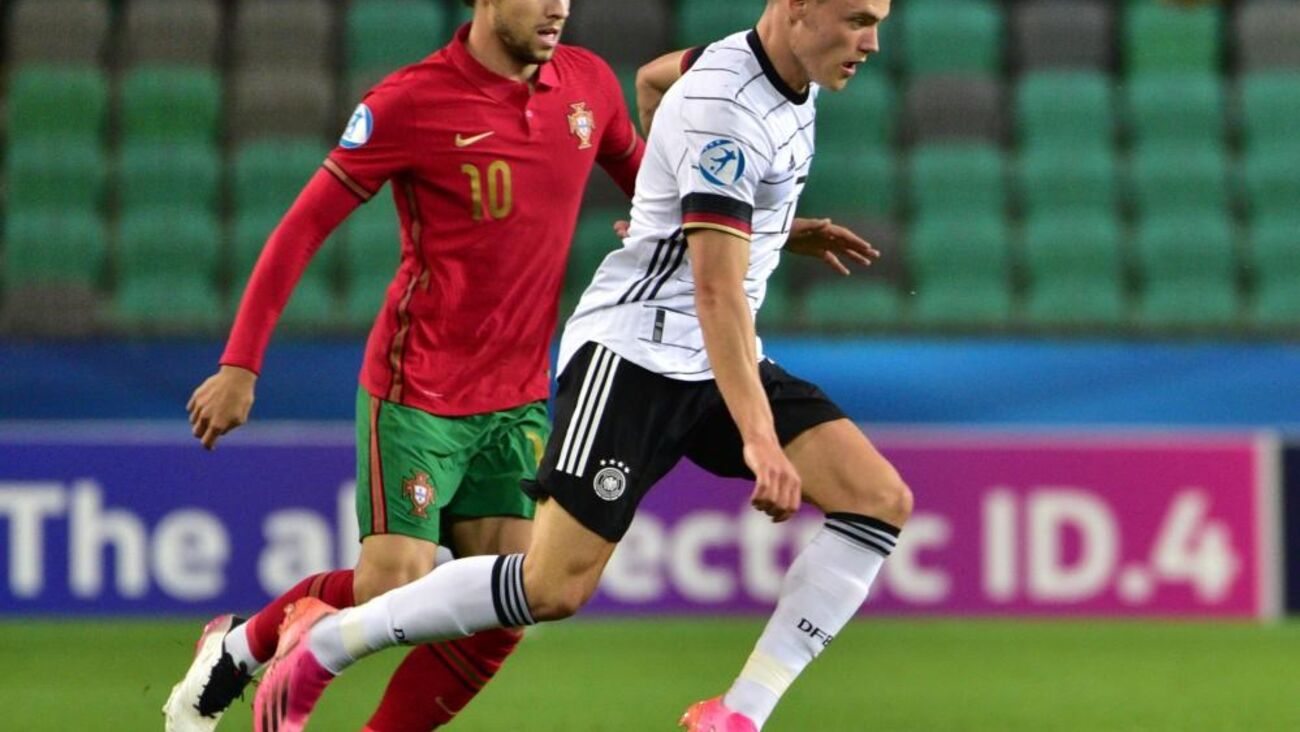 Vitinha arrancou entre os jogadores alemães e descobriu Fábio Vieira na ala direita. O médio-centro luso escorregou no momento do remate e atirou contra um defesa da Alemanha, com a bola a sair pela linha final.