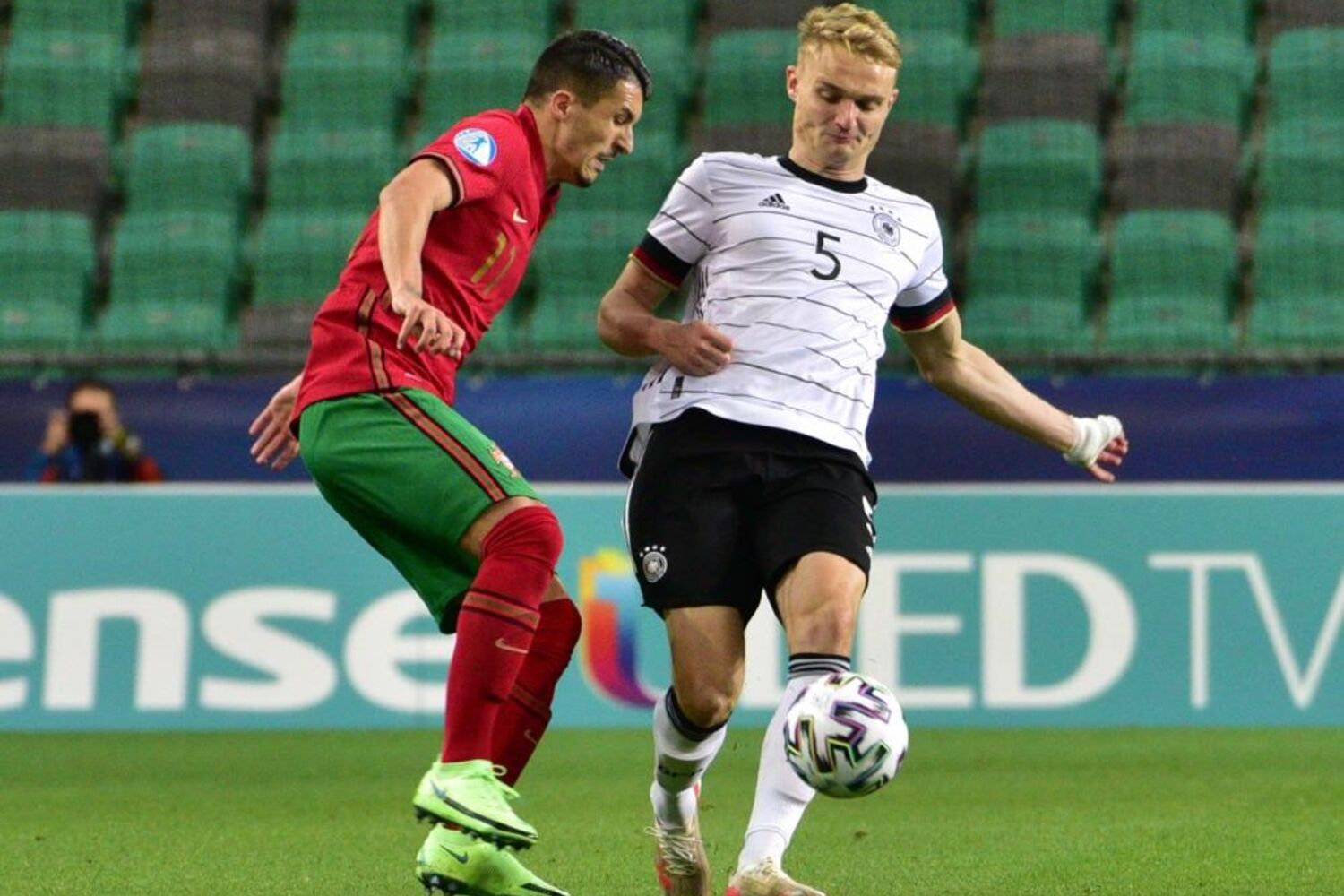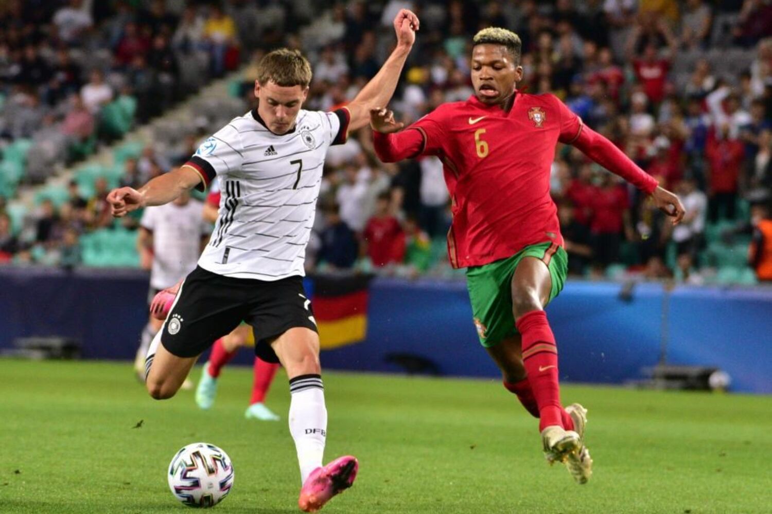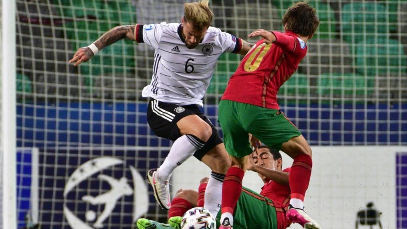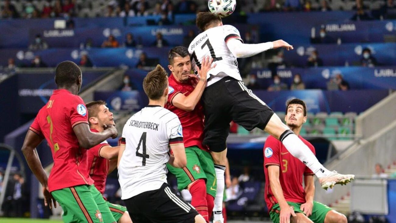 Vitinha arrancou entre os jogadores alemães e descobriu Fábio Vieira na ala direita. O médio-centro luso escorregou no momento do remate e atirou contra um defesa da Alemanha, com a bola a sair pela linha final.