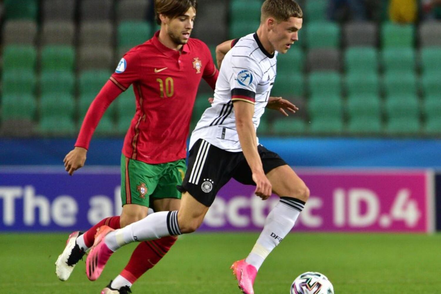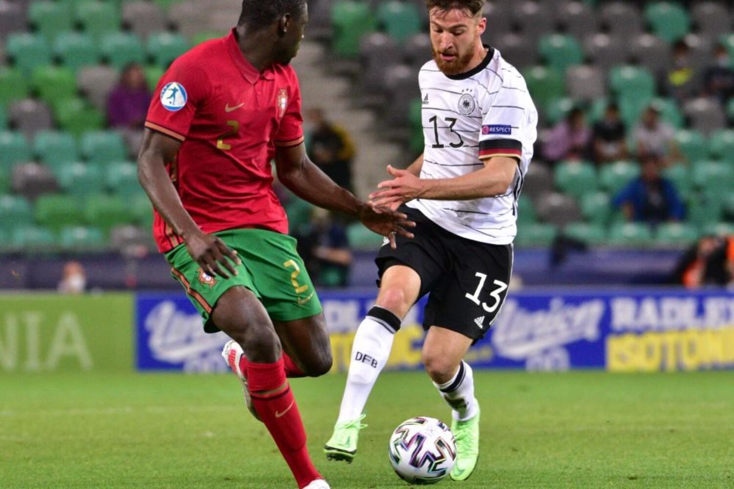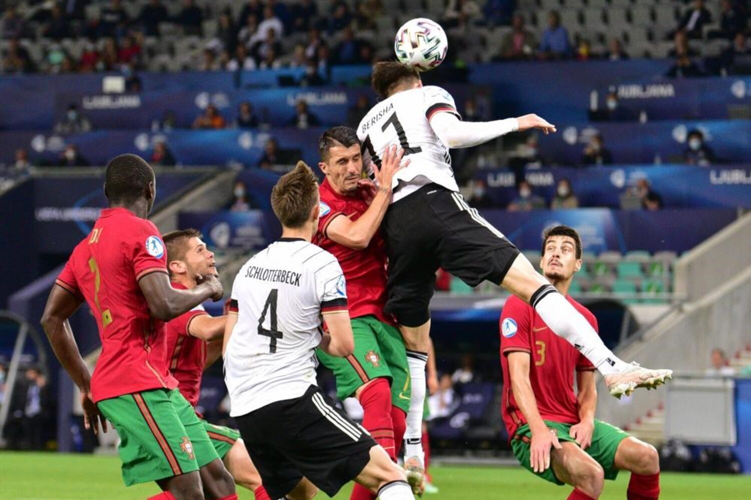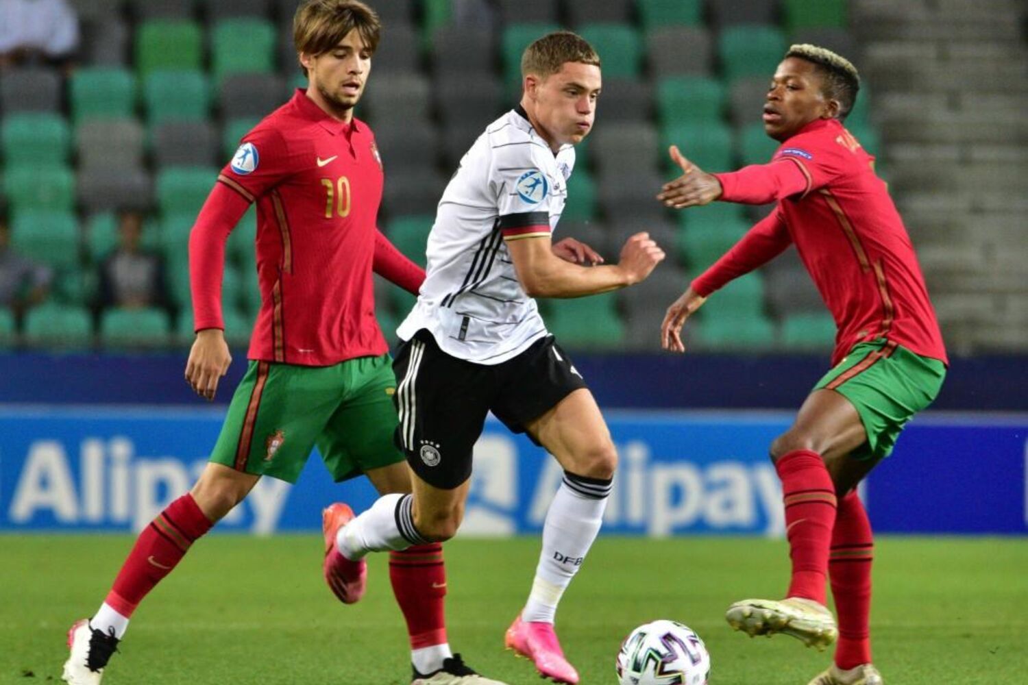 Vitinha arrancou entre os jogadores alemães e descobriu Fábio Vieira na ala direita. O médio-centro luso escorregou no momento do remate e atirou contra um defesa da Alemanha, com a bola a sair pela linha final.