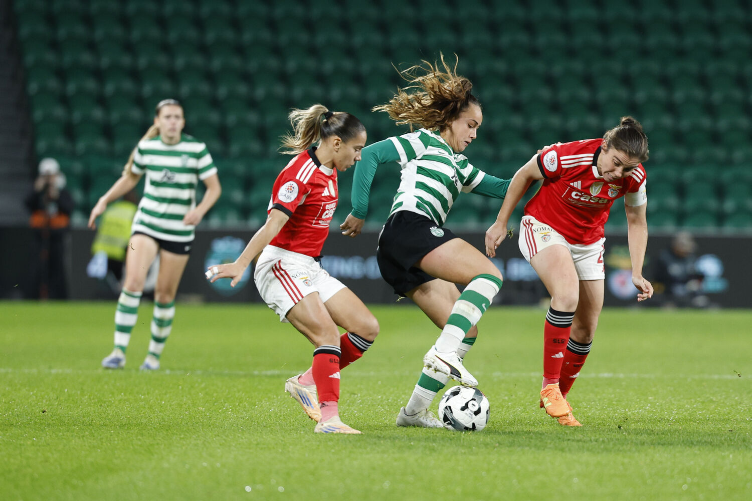 As pentacampeãs nacionais dominaram a primeira parte e queixaram-se de um golo mal assinalado logo aos 14'. Anne Gaspar marcou, mas o lance acabou invalidado. Nas poucas repetições mostradas, a jogadora benfiquista está claramente em posição regular. A vantagem encarnada surgiria pouco depois com Ncyole Raysla a cabecear para o fundo da baliza do Sporting.