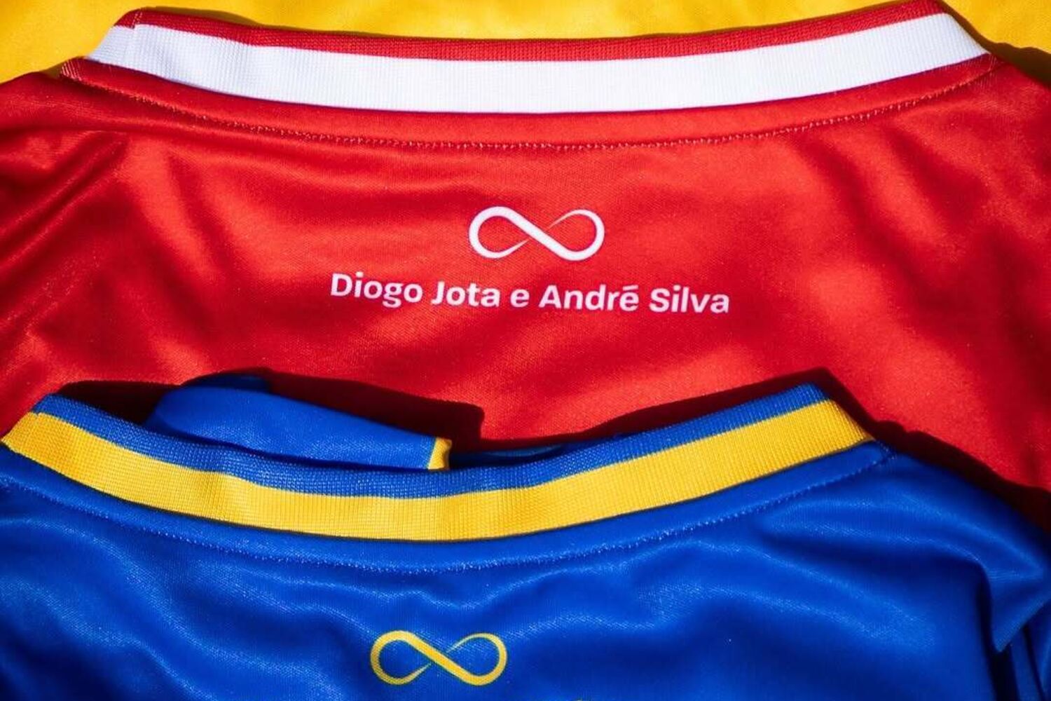 Os três equipamentos azul, vermelho e amarelo, contêm, para além da cara dos jogadores na parte da frente da camisola, os nomes de Diogo Jota e André Silva na parte de trás da gola com o símbolo do infinito.