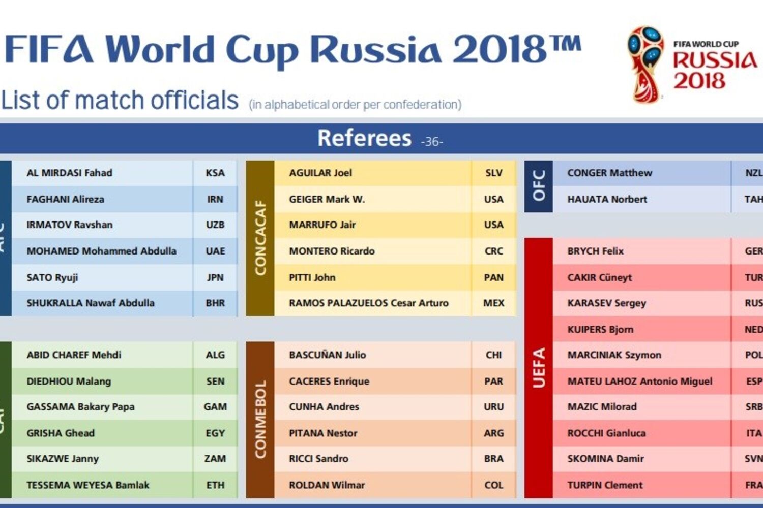 AFC: Fahad Al Mirdasi (Arábia Saudita), Alireza Faghani (Irão), Ravshan Irmatov (Usbequistão), Mohammed Abdulla Mohamed (Emirados Árabes Unidos), Ryuji Sato (Japão) e Nawaf Shukralla (Bahrain).
