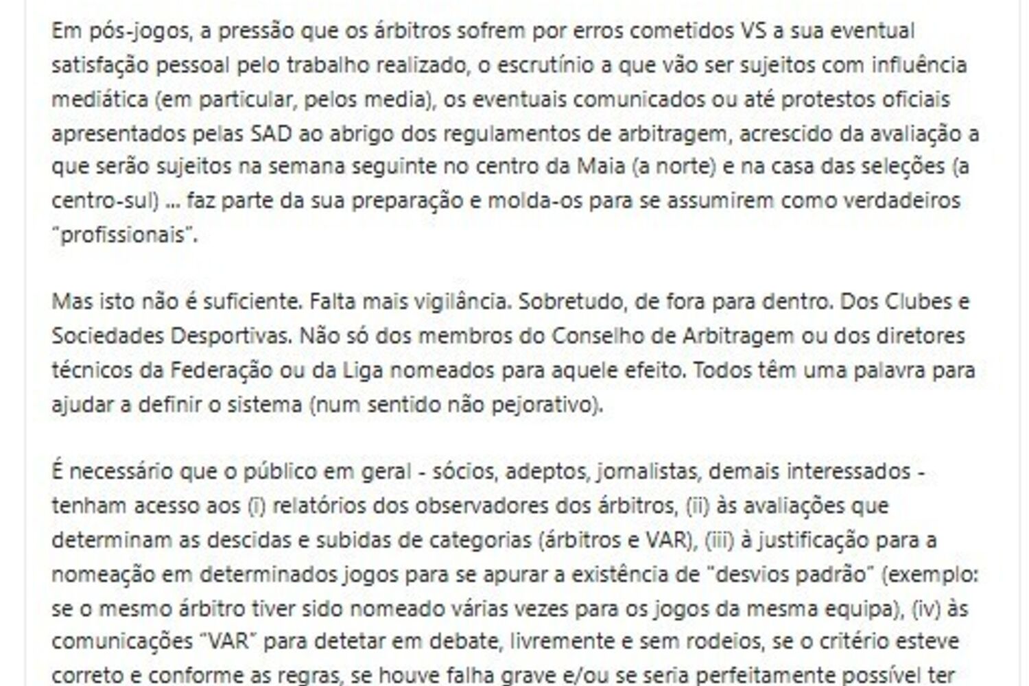 É necessário que o público em geral - sócios, adeptos, jornalistas, demais interessados - tenham acesso aos (i) relatórios dos observadores dos árbitros, (ii) às avaliações que determinam as descidas e subidas de categorias (árbitros e VAR), (iii) à justificação para a nomeação em determinados jogos para se apurar a existência de "desvios padrão” (exemplo: se o mesmo árbitro tiver sido nomeado várias vezes para os jogos da mesma equipa), (iv) às comunicações “VAR” para detetar em debate, livremente e sem rodeios, se o critério esteve correto e conforme as regras, se houve falha grave e/ou se seria perfeitamente possível ter evitado eventual erro grosseiro.