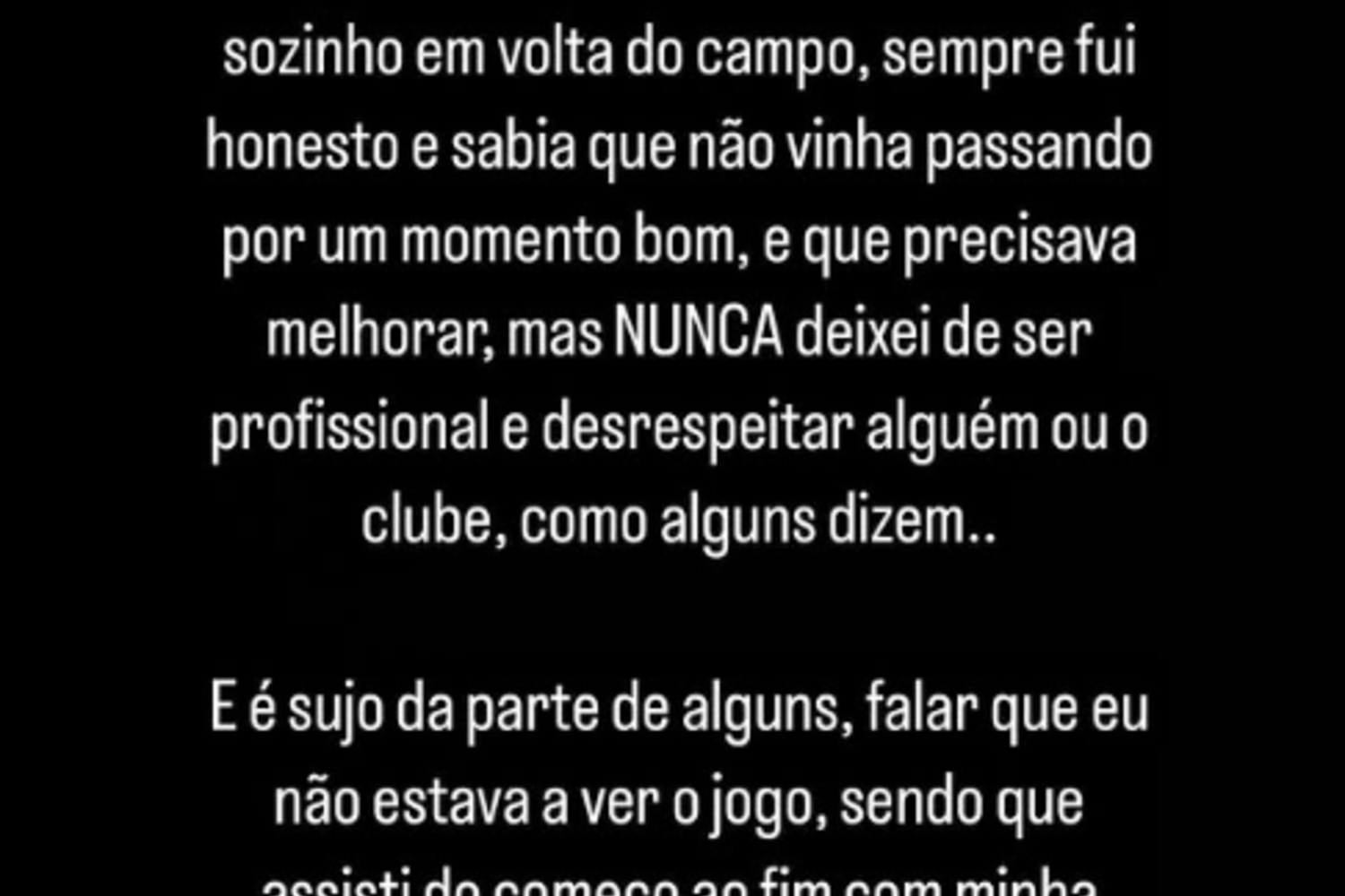 "[O Pepê não está aqui porque não quer] Diz o cara que me exclui do treino por fazer golo na mini-baliza com força, que me mandou treinar a semana toda sozinho à volta do campo. Sempre fui honesto e sabia que não vinha passando por um momento bom, e que precisava melhorar, mas NUNCA deixei de ser profissional e desrespeitar alguém ou o clube, como alguns dizem...", começou por escrever o avançado brasileiro nas redes sociais, comentando de seguida os rumores que se fizeram circular nas redes sociais, depois da derrota portista frente ao Gil Vicente (1-3), e que afirmavam que Pepê estaria online a jogar uma partida de Counter-Strike 2 na conhecida plataforma Faceit: "E é sujo da parte de alguns, falar que eu não estava a ver o jogo, sendo que eu assisti do começo ao fim com a minha família e, meus amigos, dizem que eu estava a jogar? Da mesma forma que eu estou no Dragão e essa mesma conta está a jogar, ou também trouxe o portátil para cá? É mais fácil julgar do que ir atrás da verdade..."