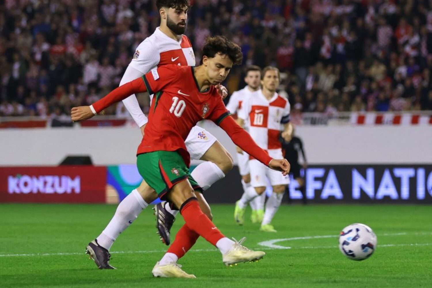 O guião parecia estar escrito para um final feliz. Primeira parte em grande estilo, golaço de João Félix, oportunidades para marcar mais, futebol solto, alegre, divertido. Mas na segunda metade, Portugal quase deitou tudo a perder, após quebra evidente de vários jogadores e, acima de tudo, de decisões inexplicáveis de Roberto Martínez, com trocas tardias e mal engendradas. Assim, o que podia, e devia, ter sido um teste muito positivo, num jogo que, para Portugal, era ‘a feijões’, pois o apuramento para os quartos de final da Liga das Nações estava garantido, acabou por se tornar num ‘match’ em clara perda. No tempo de descontos, a Croácia atirou ao ferro (pela terceira vez no jogo) e viu Dalot, em cima da linha, negar-lhe a vitória. O que fizeram os croatas para garantir esse ascendente? Pouco. Aumentaram a pressão no segundo tempo, mas acima de tudo agradeceram a forma como Portugal andou para trás, depois de ter o jogo na palma da mão.