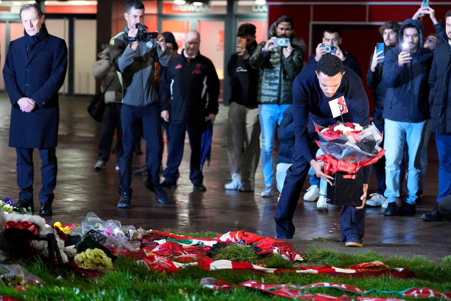 Xabi Alonso, treinador dos madrilenos e antigo jogador da formação inglesa, e Emilio Butragueño, diretor de relações institucionais do clube espanhol, acompanhados pelos jogadores Dean Huijsen e Trent Alexander-Arnold, foram até ao cenotáfio em honra do malogrado jogador português, que perdeu tragicamente a vida em acidente de viação.