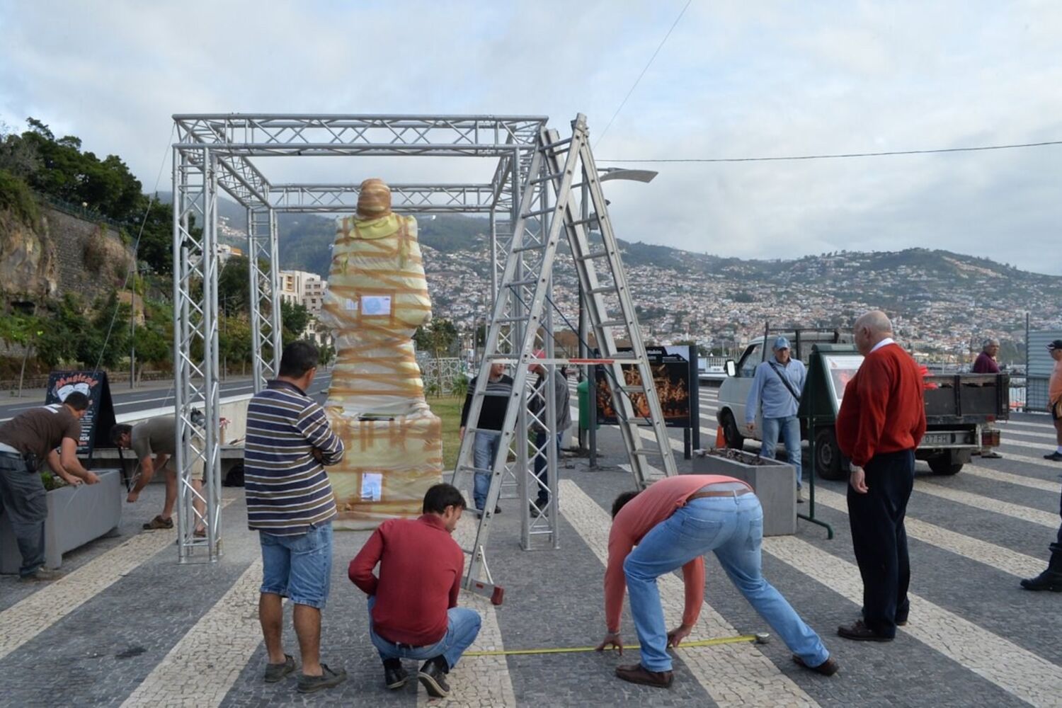Ontem, foram ultimados os preparativos da cerimónia. Algumas dezenas de madeirenses já se deslocaram à marginal do Funchal para observarem a ainda tapada estátua do craque português.