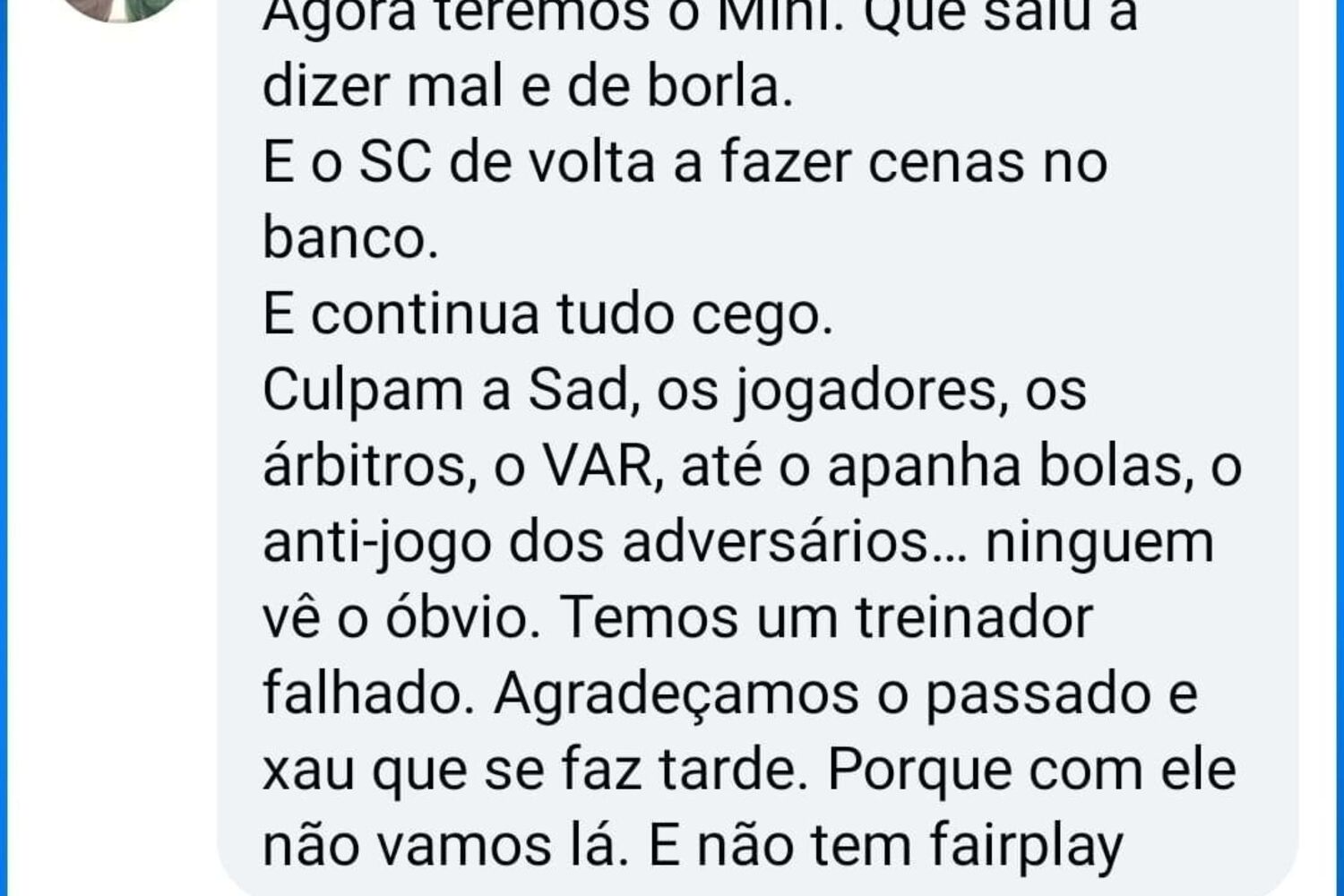 Voltando ao alegado comentário de Rui Moreira, feito como resposta a uma outra publicação no Facebook, o presidente da CM Porto atira: "Agora teremos o Mini [n.d.r.: Francisco Conceição]. Que saiu a dizer mal e de borla. E o Sérgio Conceição de volta a fazer cenas no banco. E continua tudo cego. Culpam a SAD, os jogadores, os árbitros, o VAR, até o apanha-bolas, o anti-jogo dos adversários... ninguém vê o óbvio. Temos um treinador falhado. Agradeçamos o passado e xau que se faz tarde. Porque com ele não vamos lá. E não tem fair-play."
