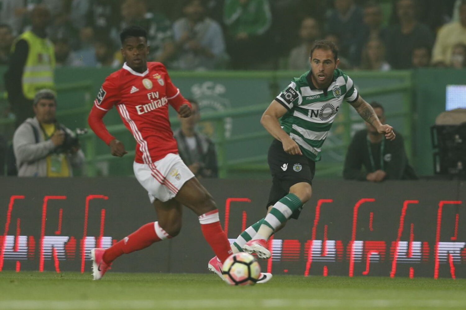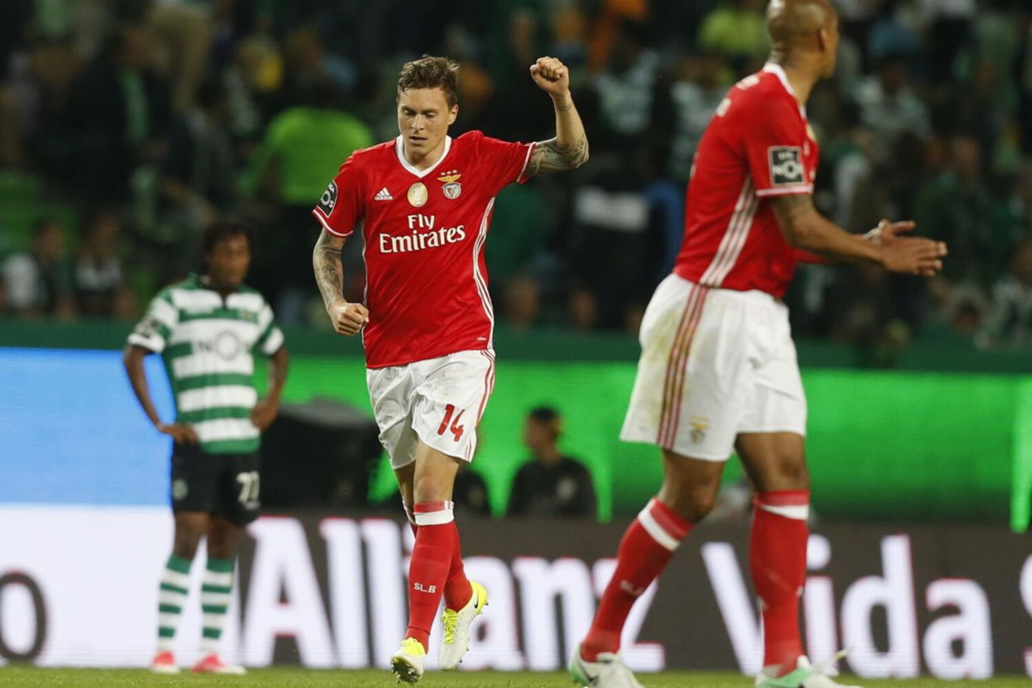 Com este resultado, o Benfica passou a somar 72 pontos, mais quatro do que o FC Porto, que joga no domingo com o Feirense, e mais oito dos que o Sporting.----------90+3' - Termina a partida! Empate em Alvalade.90+2' - Cartão amarelo para Luisão.90' - Três minutos de compensação.88' - Última alteração no Sporting. Gelson sai para a entrada de Campbell.