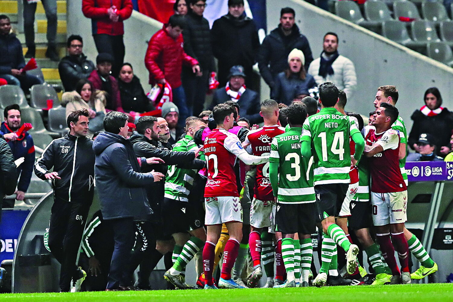 O leão encheu-se de brio e quis atacar. Não tinha cabeça nem capacidade. Mathieu teve uma entrada fora de tempo sobre Esgaio. Percebeu que seria expulso. Gerou-se um sururu com os suplentes e o guarda-redes minhoto, Eduardo, e o defesa leonino Borja também acabaram expulsos.