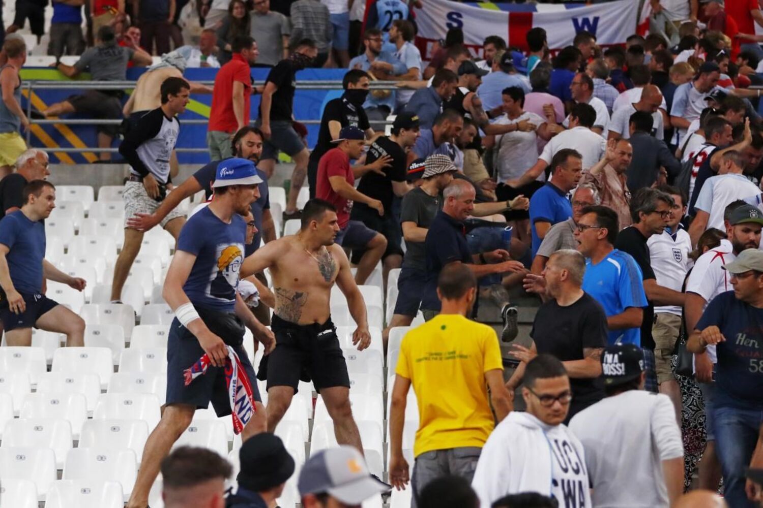 Depois de três dias de violência na zona do porto velho de Marselha, os incidentes alastraram-se às imediações e ao interior do estádio Velodrome, palco do jogo entre ingleses e russos, realizado no sábado, que terminou empatado 1-1.