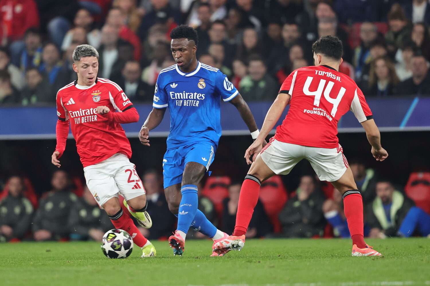 Prestianni leva as mãos à cabeça. O argentino tenta surpreender, furando pela esquerda mas... depois decide mal. O remate passa longe da baliza do Real Madrid.