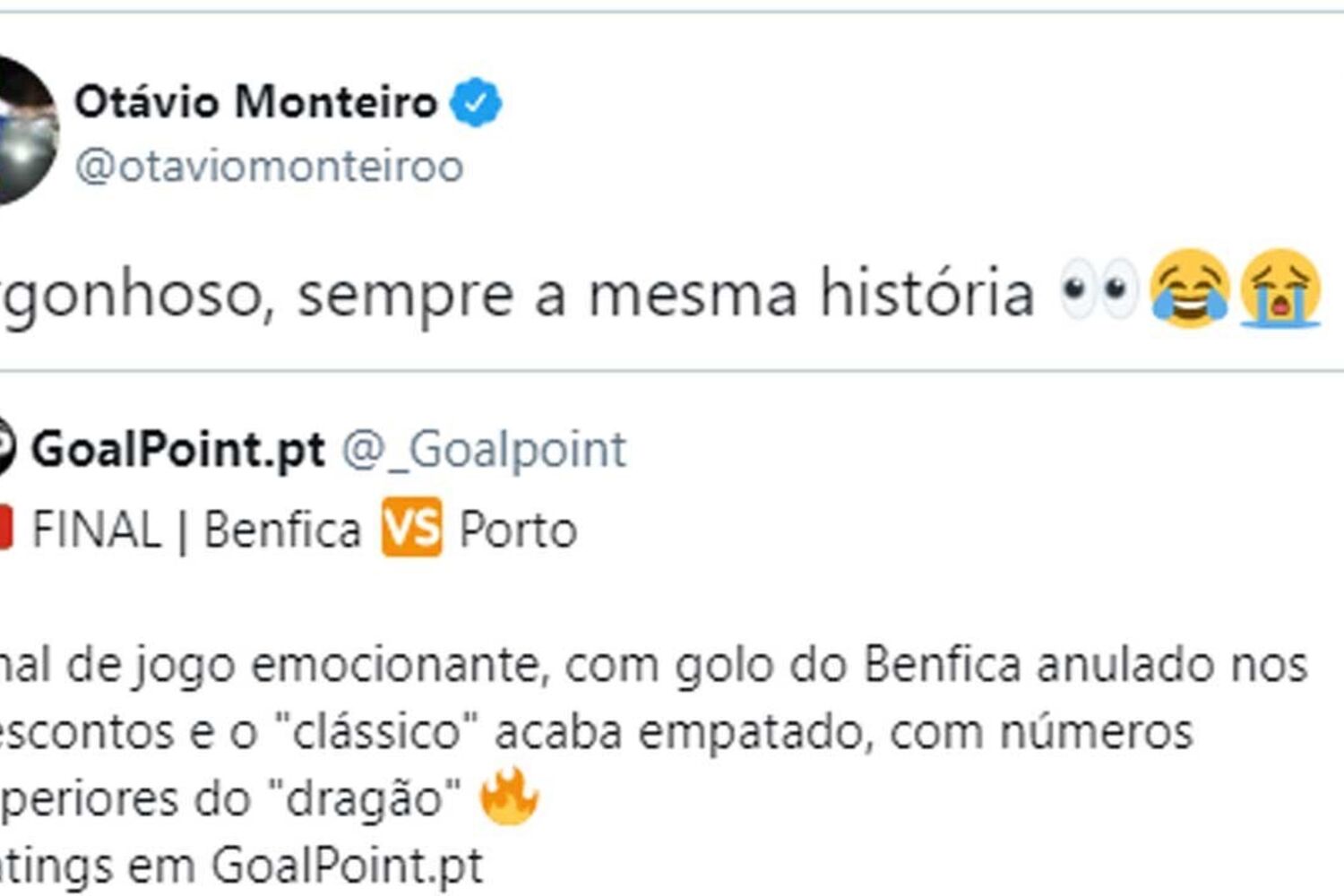 Ora, instantes depois, Otávio, também no Twitter, partilhou uma imagem da ficha de jogo e utilizou a mesma expressão do espanhol, com emojis sorridentes e de choro. "Vergonhoso, sempre a mesma história", disparou o médio portista. Vergonhoso, sempre a mesma história https://t.co/mWDdAzM44m— Otávio Monteiro (@otaviomonteiroo) May 6, 2021