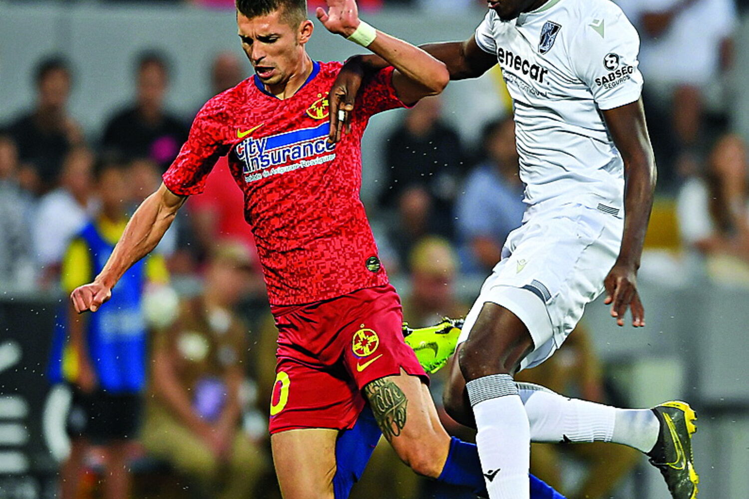 Os vitorianos deram um autêntico amasso aos romenos no primeiro tempo e só não saíram para o intervalo com uma vantagem dilatada porque falharam clamorosamente na finalização. Balgradean negou o golo a Pêpê logo aos 3' e depois sucederam-se as ocasiões pelo mesmo Pêpê, por Rochinha, Bruno (cabeceamento à barra) e Poha. O golo anunciado surgiu logo após o intervalo (53'), com o jovem Tapsoba a converter uma grande penalidade por falta cometida sobre Davidson. O jogo abriu e continuou o festival de desperdício, com Davidson e Rochinha como protagonistas.