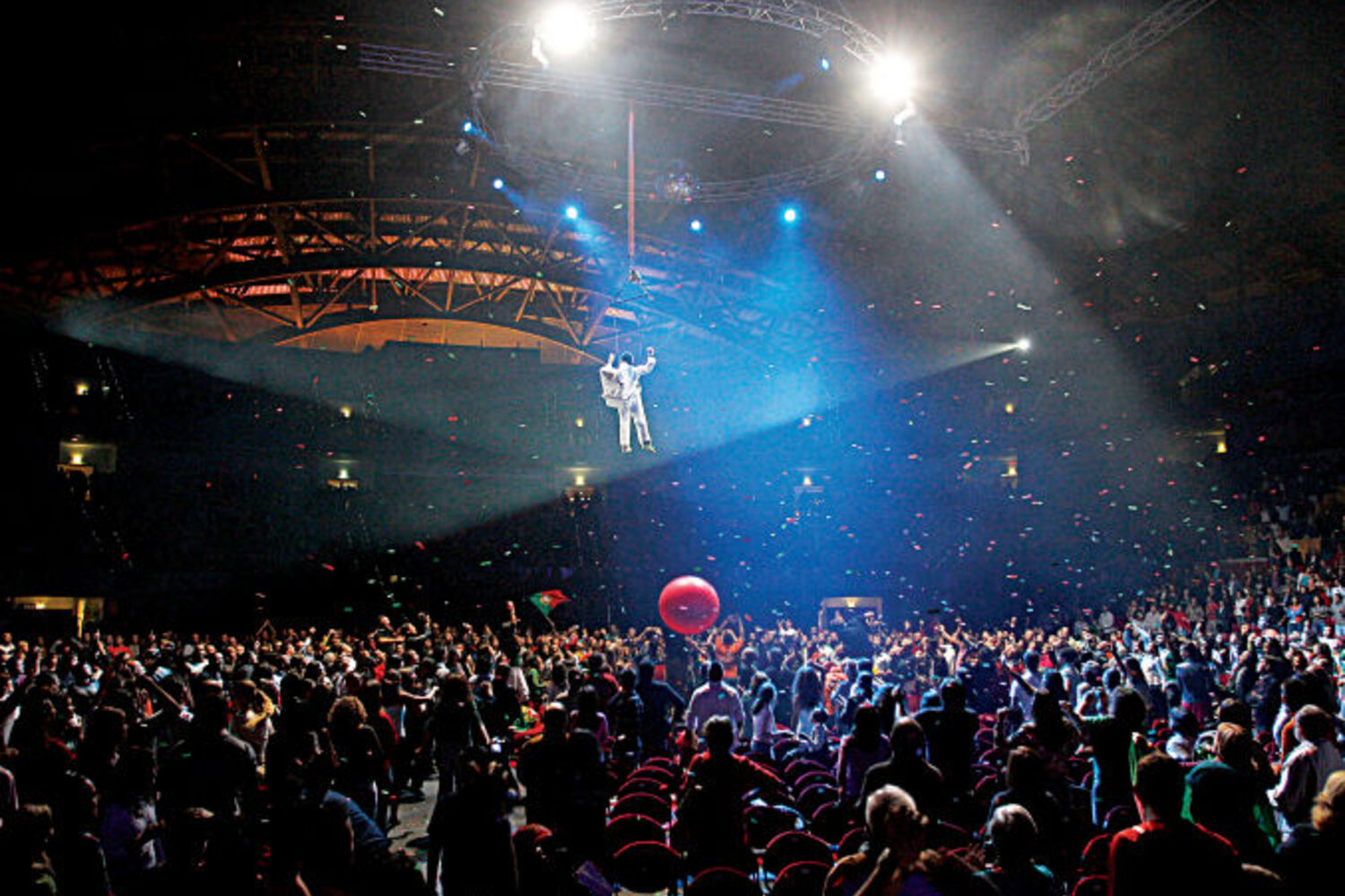 Já passam 40 minutos da hora marcada quando as luzes do Pavilhão Atlântico desvanecem. Os três ecrãs gigantes do palco dão as instruções em forma de legendas brancas em fundo negro. Pedem-se palmas, assobios e batidelas de pé no chão e os cerca de seis mil espectadores – eram esperados 10 mil – acedem. Está dado o mote para as próximas quatro horas. A ordem é a diversão e todos cumprem.