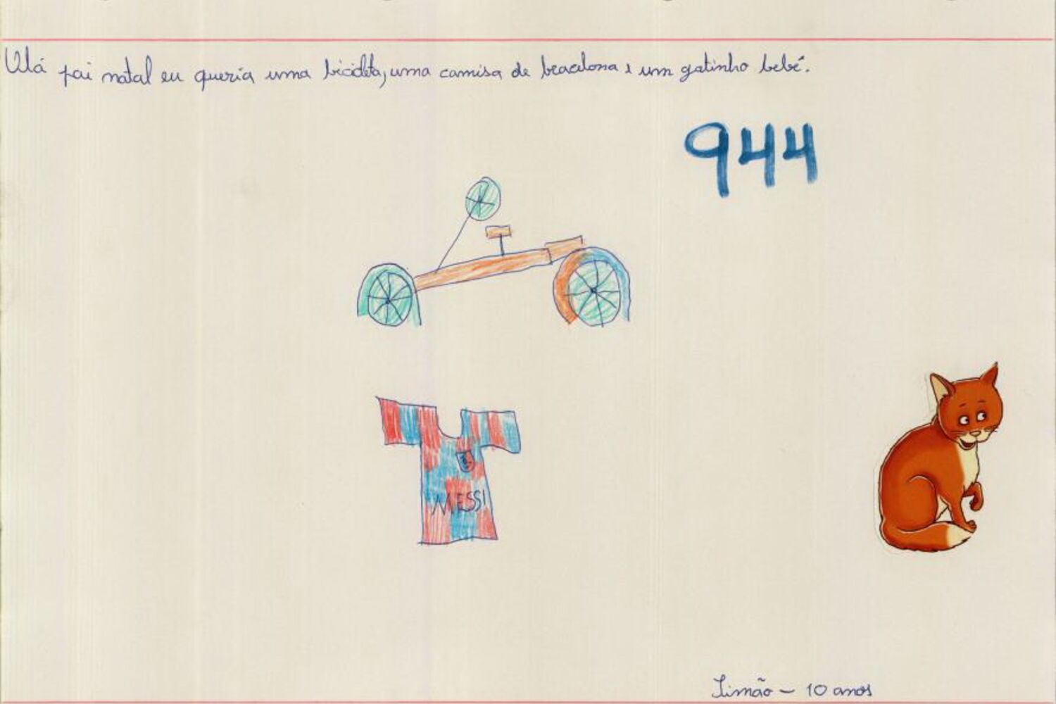 "Meu Querido Pai Natal. Antes de mais um bom Natal para ti e uma festa para as tuas fofinhas renas. Este ano queria pedir roupinha para mim pois eu visto 13/14 anos e uns ténis com luzes nº 31, se puderes. Olha, podes dar-me saúde e notas boas na escola para orgulhar a minha família e mostrar que eu mereço passar o ano. Olha, os meus amigos da minha turma te mandam um beijinho e saúde para nos vêres crescer. Desta criança que te adora".