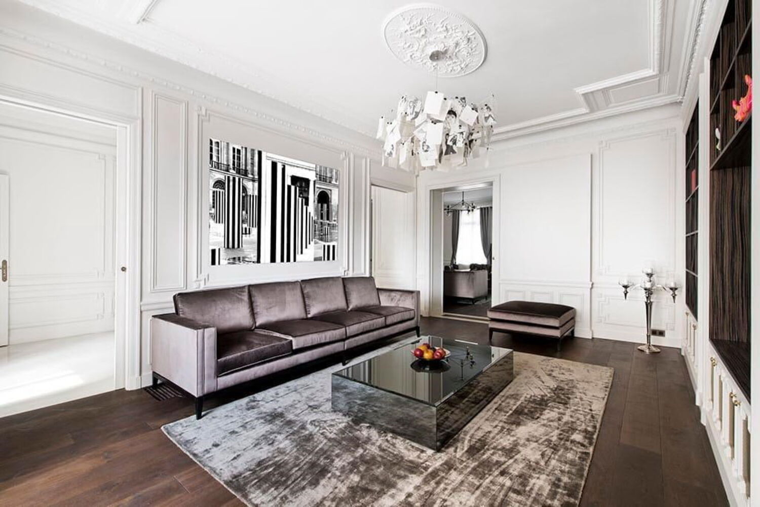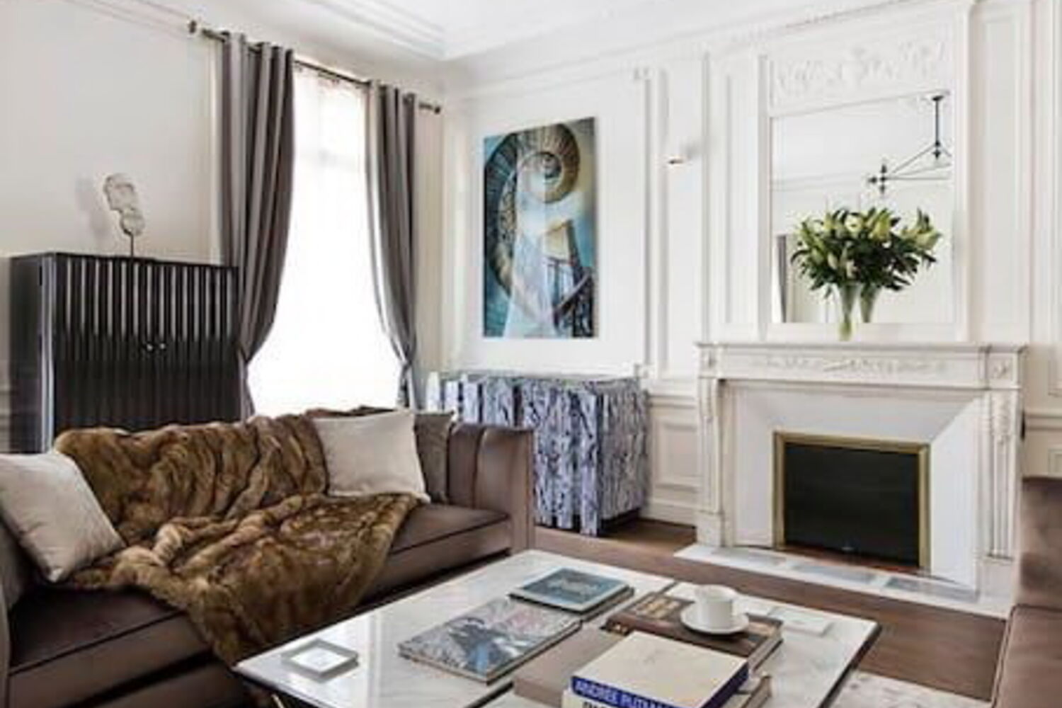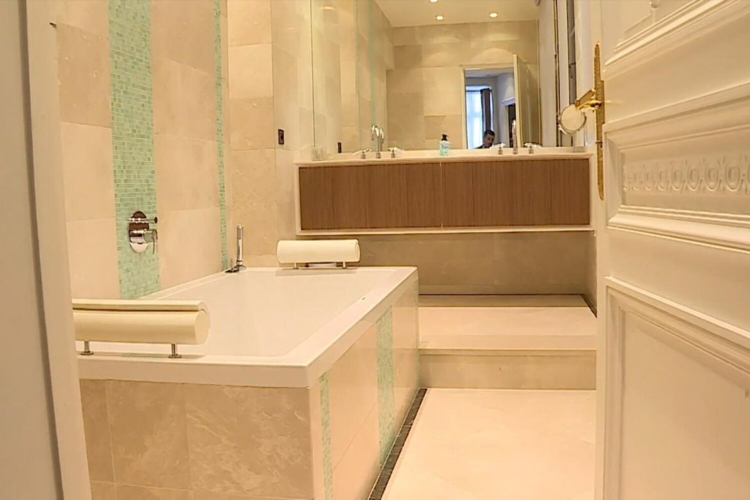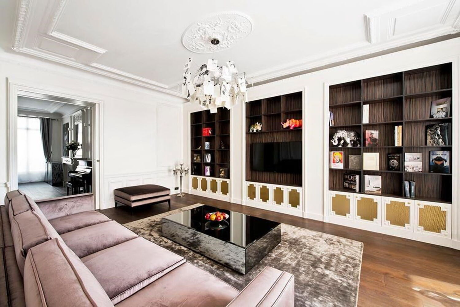 Mas assim que entramos no apartamento, são os elementos decorativos e o mobiliário caro que saltam à vista. O soalho é em pedra mármore em grande parte do apartamento.