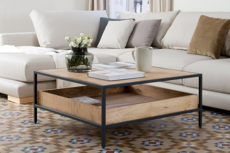 Bosto - Mesa de centro quadrada de madeira maciça de mangueira e metal