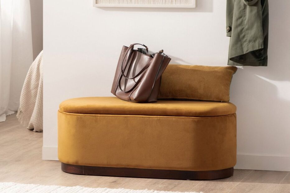 Uma das formas mais eficazes de começar a organizar a casa é aproveitar zonas de passagem, como o hall de entrada ou o fundo da cama. O banco Isola com armazenamento estofado em veludo mostarda é um excelente exemplo disso: elegante e acolhedor, oferece um compartimento interior perfeito para guardar mantas, almofadas ou até aqueles objetos que nunca sabemos exatamente onde colocar.
