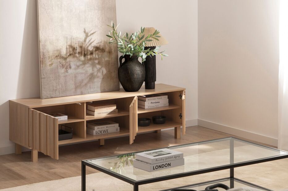 VER PREÇONa sala, o móvel TV Otto 160, em madeira cor, natural ajuda a resolver um problema comum: cabos, comandos e gadgets que parecem multiplicar-se à volta da televisão. Com espaço de arrumação discreto e um visual leve, mantém tudo no sítio certo enquanto contribui para uma sala mais equilibrada e visualmente tranquila.