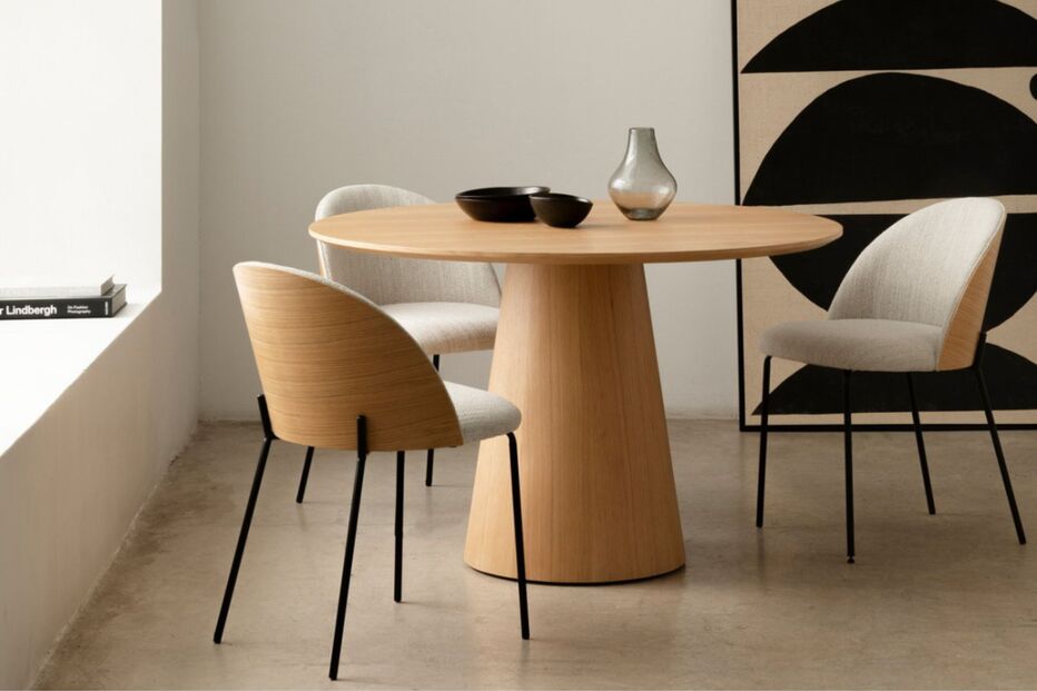A Delton destaca-se pelo seu carácter natural e acolhedor, graças ao folheado de carvalho e à madeira maciça. O formato redondo cria uma atmosfera intimista e equilibrada, ideal para refeições tranquilas. É uma mesa que adiciona textura e calor ao espaço sem perder elegância.