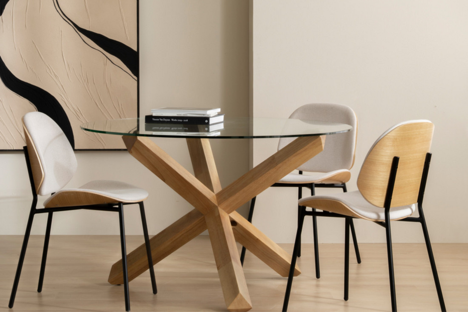 A mesa de jantar redonda Cross combina a leveza do tampo em vidro com a solidez da madeira maciça, criando uma peça elegante e acolhedora para qualquer sala de refeições. Com 120 cm de diâmetro, é ideal para momentos à mesa em família ou com amigos, destacando-se pelo seu design moderno e pela harmonia entre materiais naturais e contemporâneos.