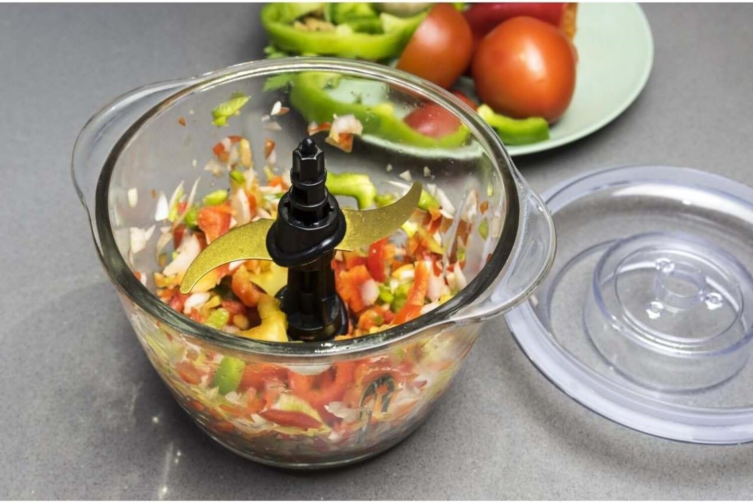 Ao puxar a alça aciona as lâminas no interior de forma segura e precisa para picar alimentos a gosto