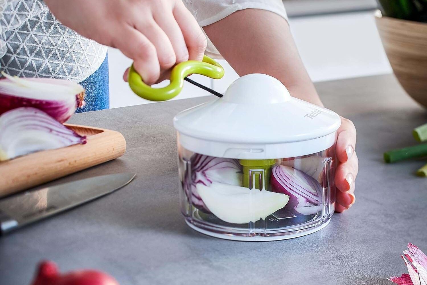 Picadora manual Tefal Fresh Kitchen 5 Segundos Rápida e eficaz. O sistema inteligente patenteado permite picar alimentos de maneira rápida, eficiente e sem esforço, com um simples gesto. Quanto mais puxar, mais será o corte aplicado. Cinco segundos é quanto baste para ter os alimentos preparados a gosto. As lâminas de aço inoxidável ultrarresistentes podem cortar qualquer tipo de alimento neste sistema super seguro e prático. O copo transparente de 500 ml desta Tefal Fresh Kitchen permite controlar facilmente o resultado que está a obter ao puxar o manípulo que aciona as lâminas no interior.